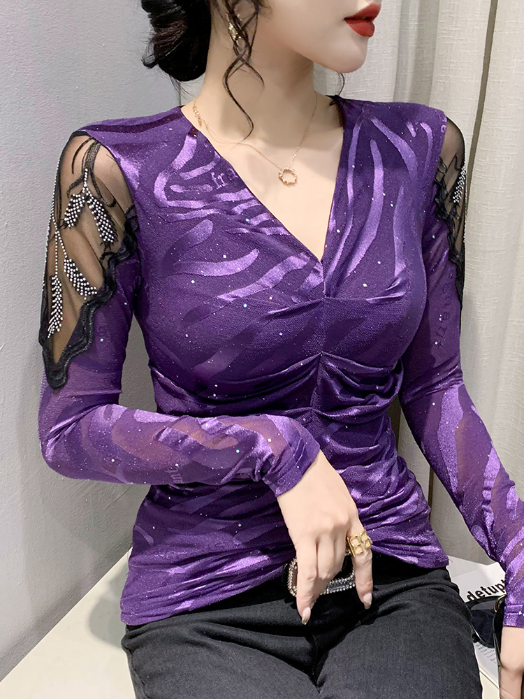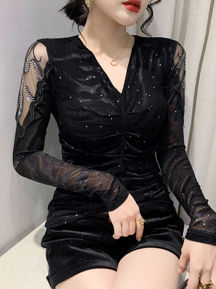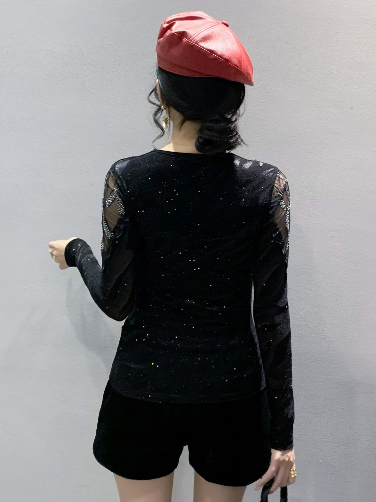 2024秋冬新款性感V领网纱T恤女长袖洋气烫钻上衣紧身内搭打底小衫