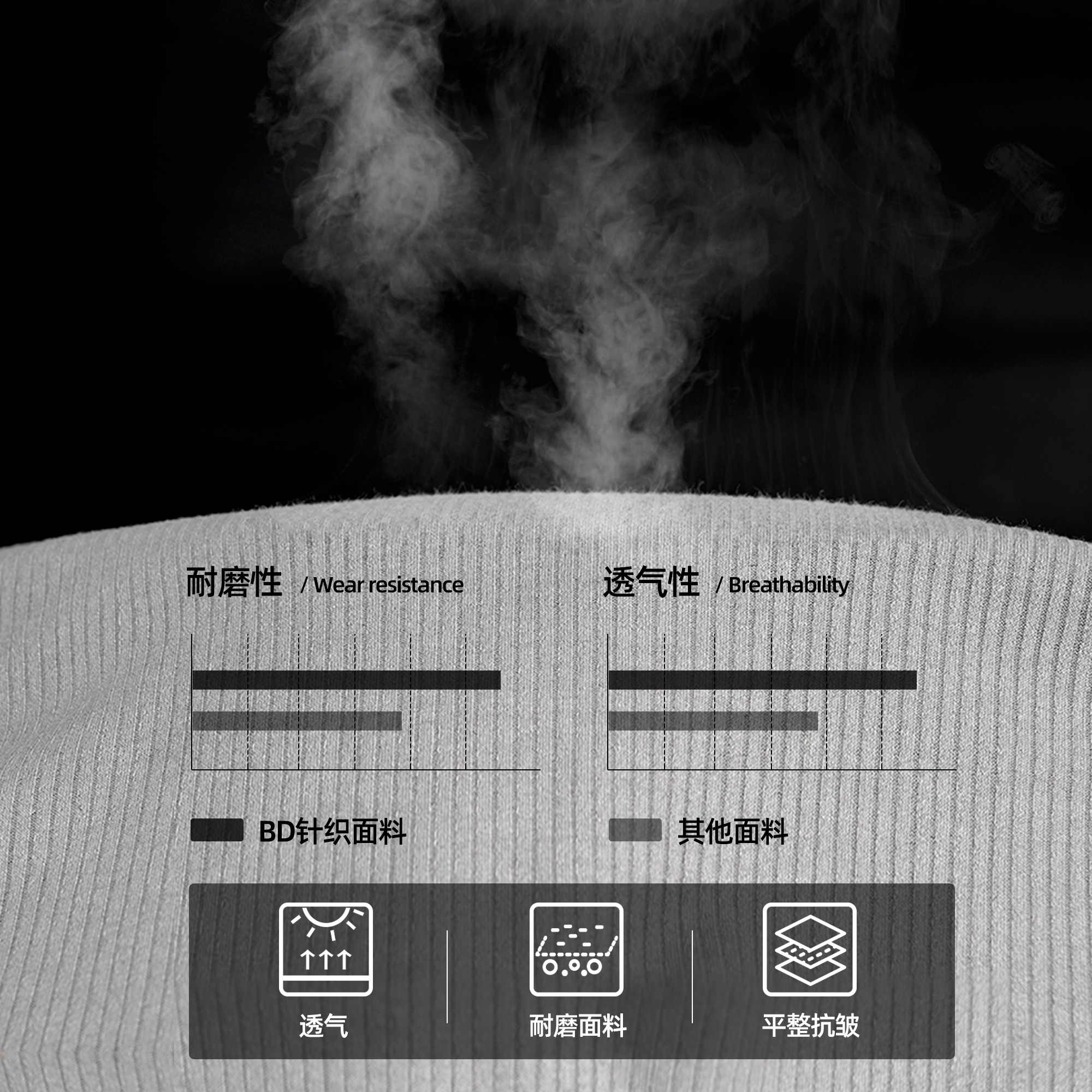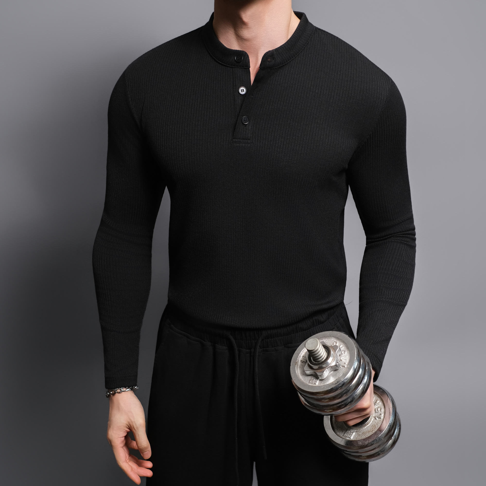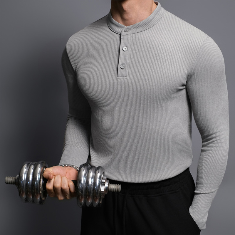 BD健美站亨利领修身长袖t恤男简约纯色正肩上衣健身针织打底衫