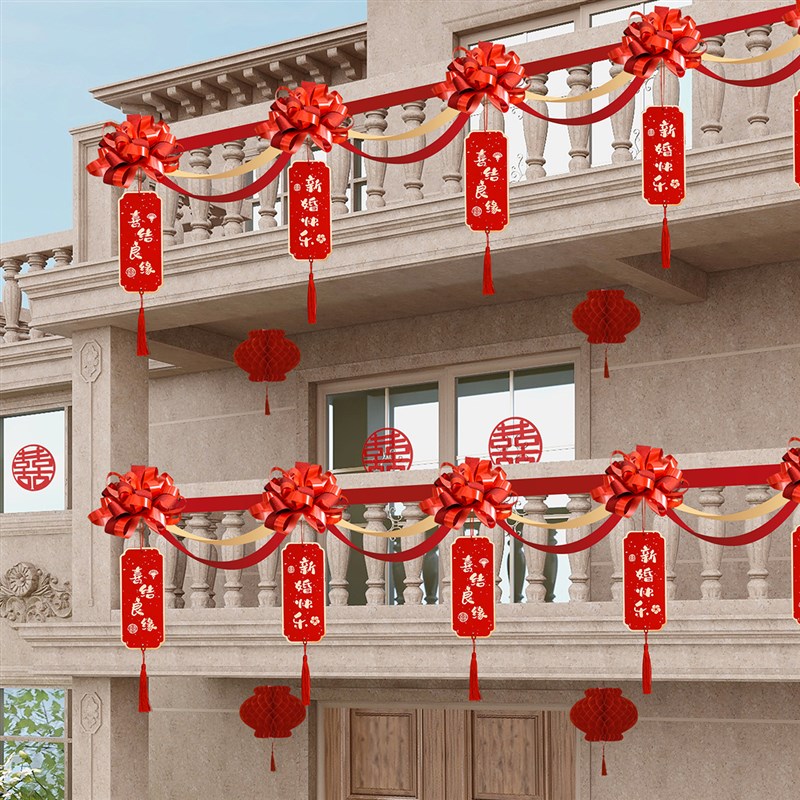 农村结婚阳台护栏装饰栏杆拉花男方婚庆用品婚房布置套餐婚礼彩带