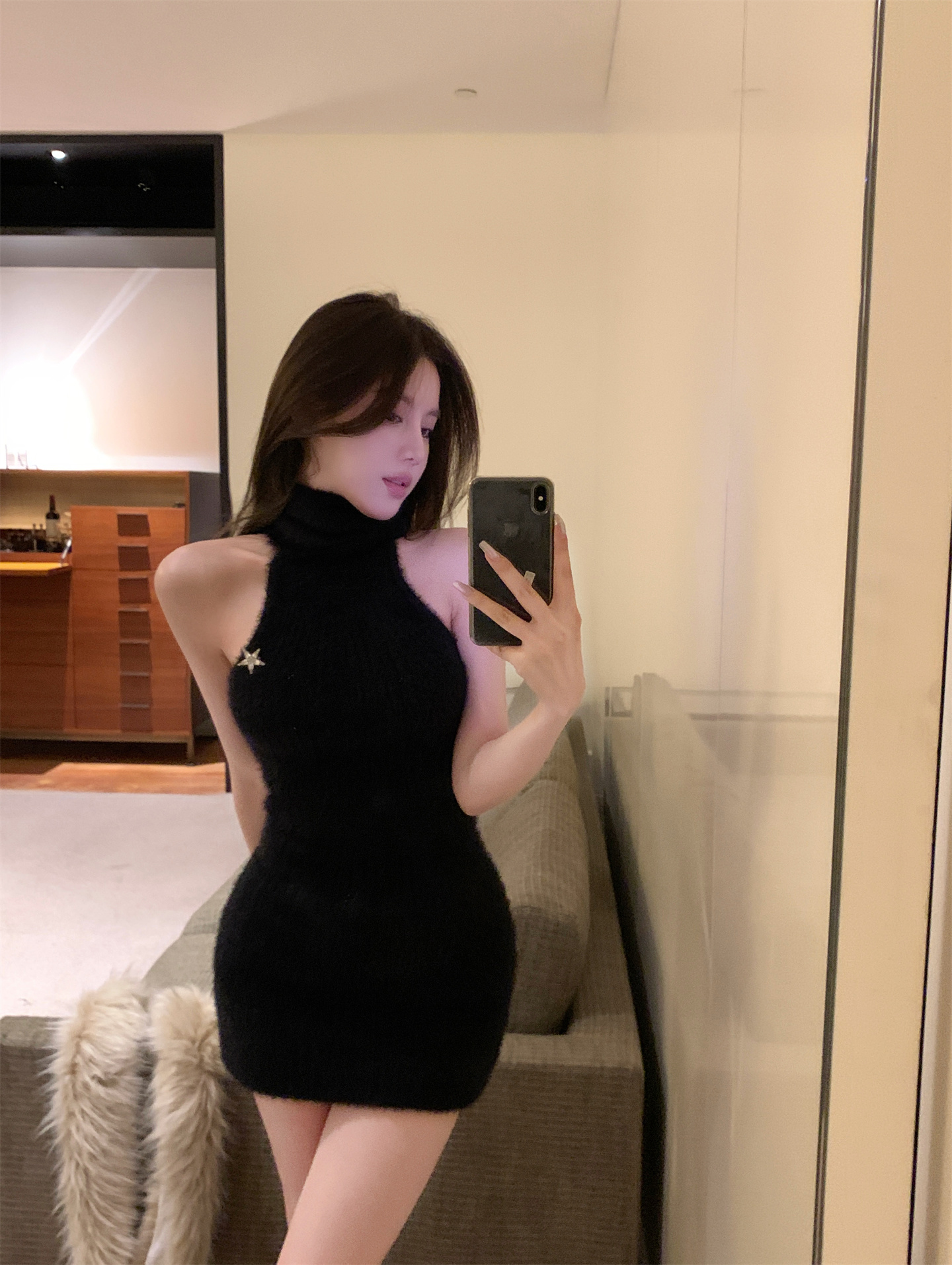 秋冬包臀连衣裙女内搭打底纯欲气质高领修身显胸背心连衣裙