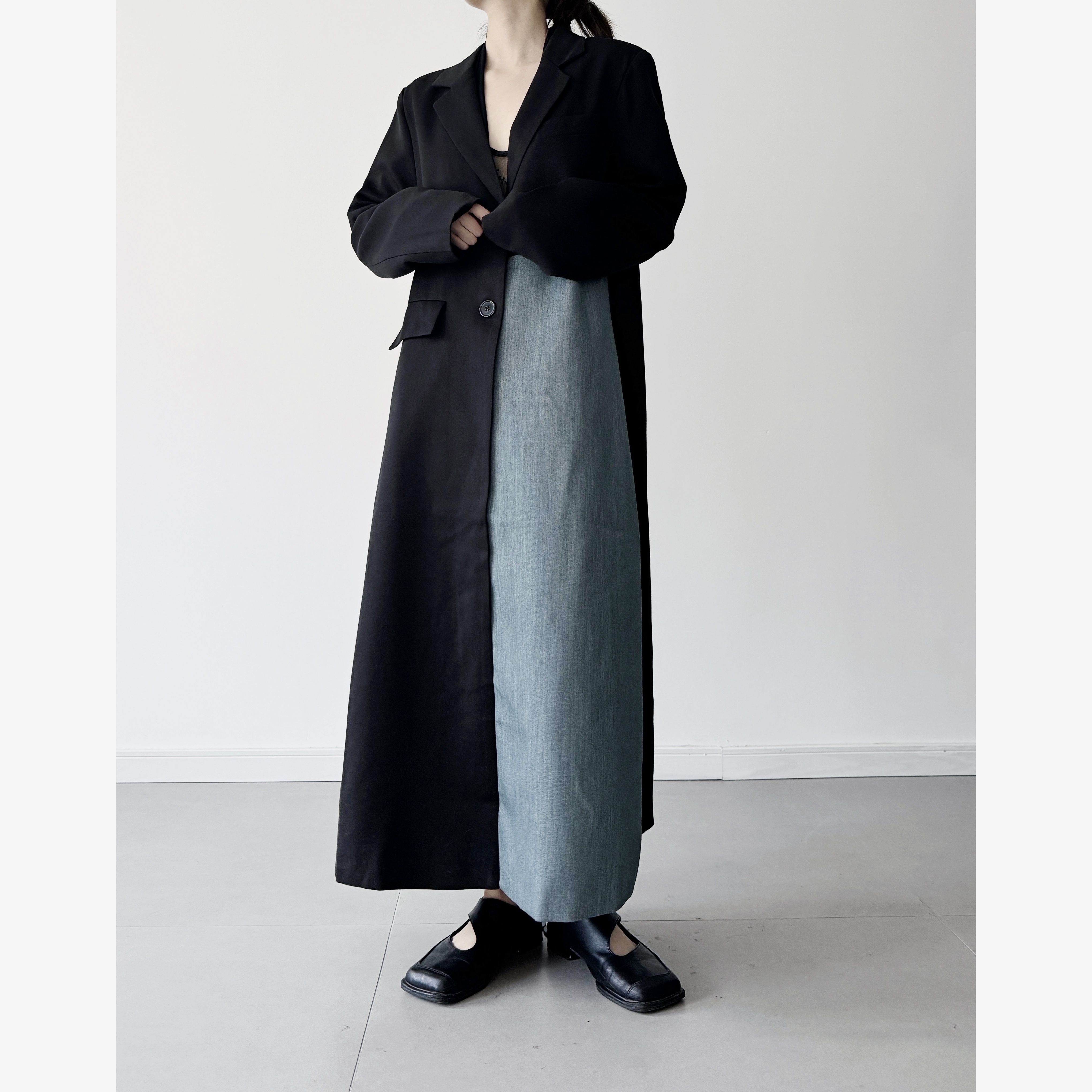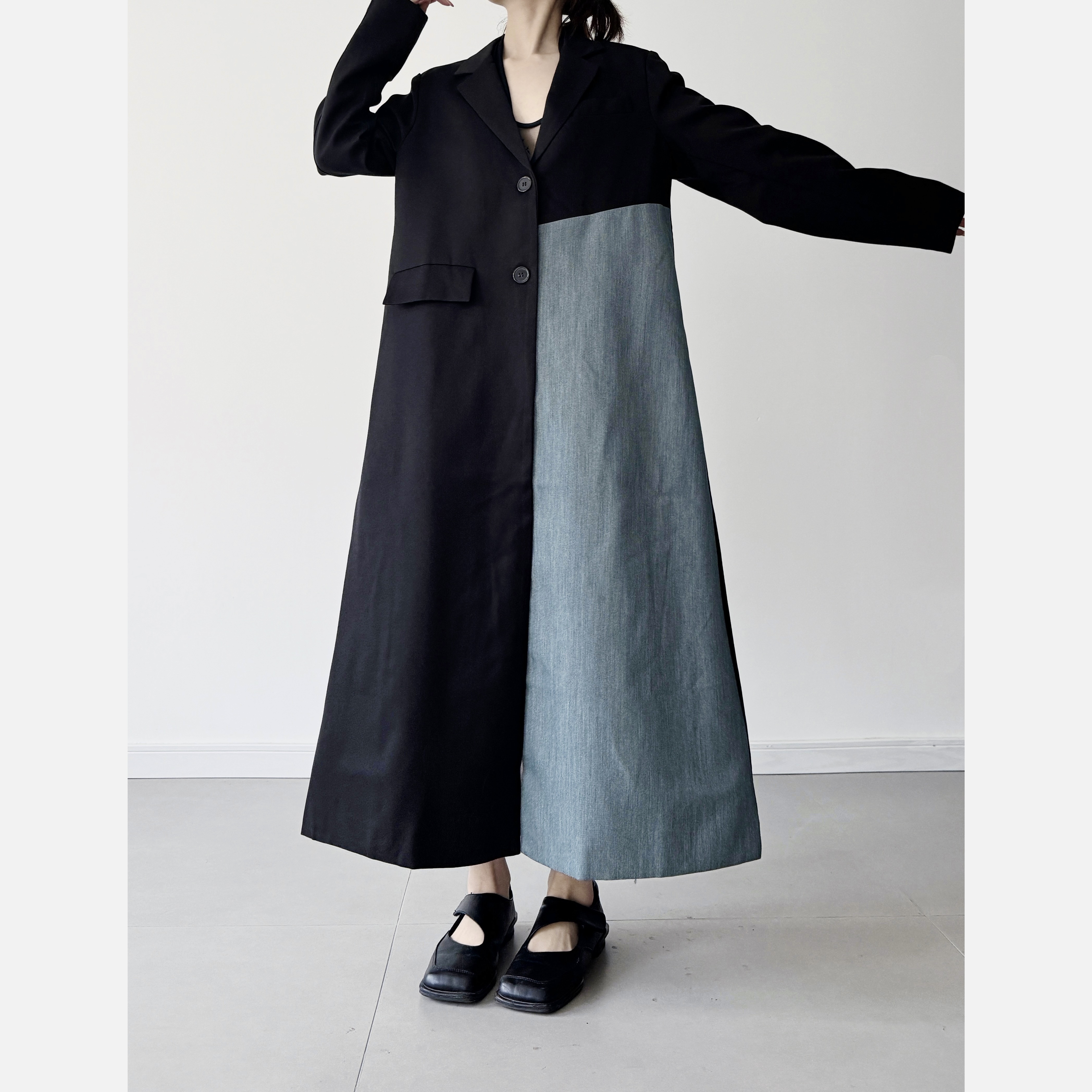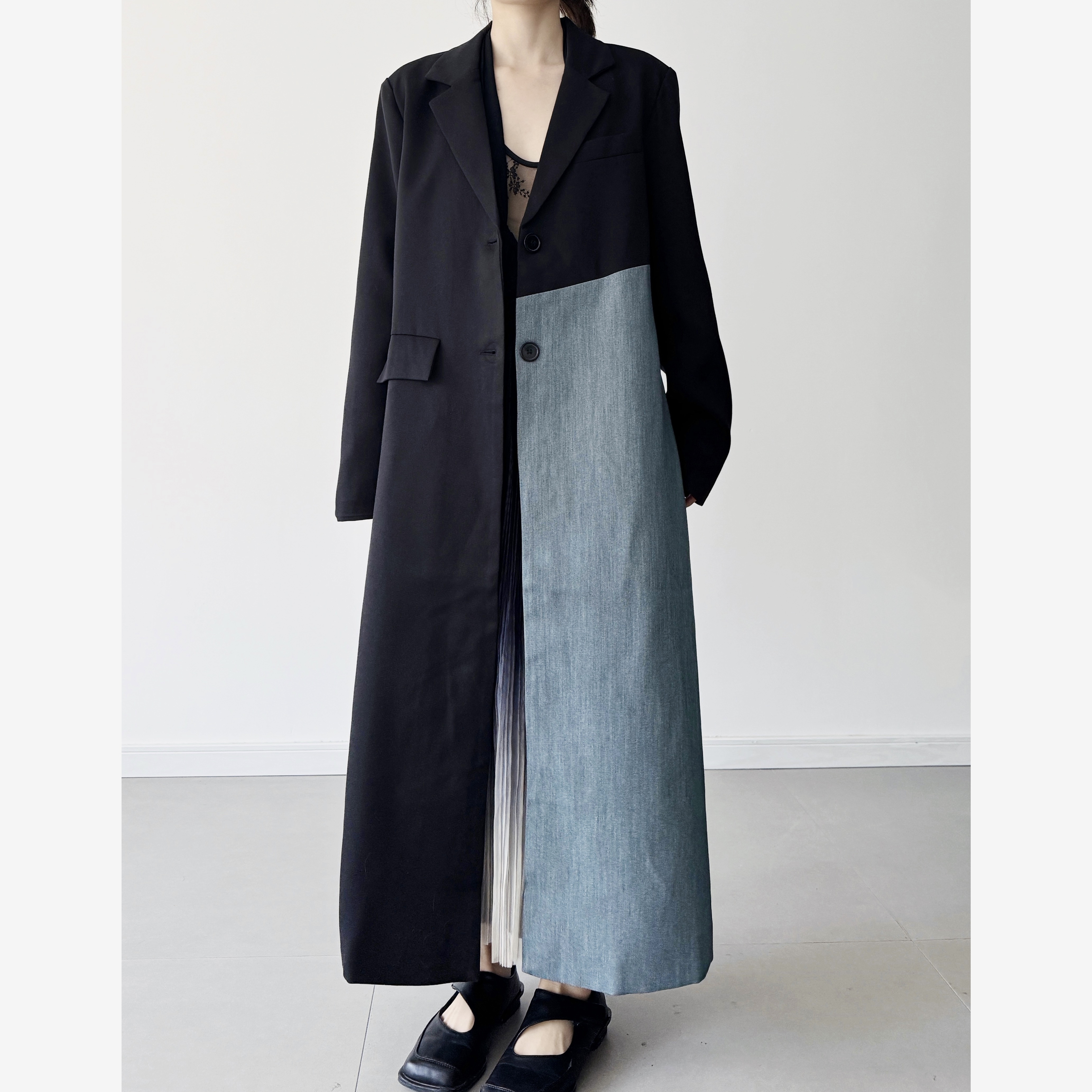 浮木兮/撞色拼接高级感风衣女春季小众设计款黑色长款西装外套