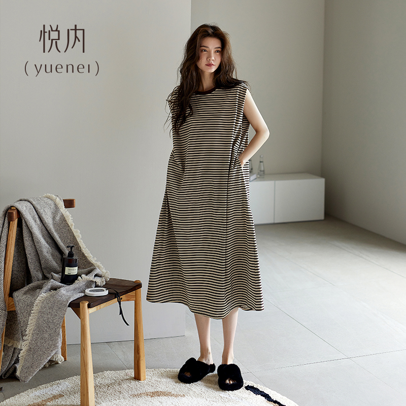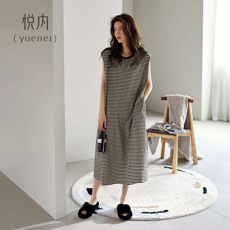 悦内睡裙女睡衣夏季无袖背心纯棉夏款夏天大码条纹长款可出门外穿