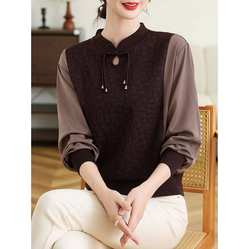 新中式妈妈春装长袖针织小衫2025新款中老年女装洋气纱袖T恤上衣