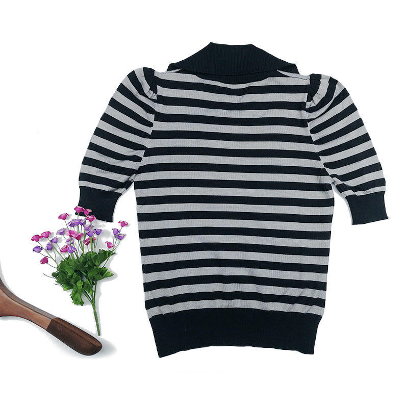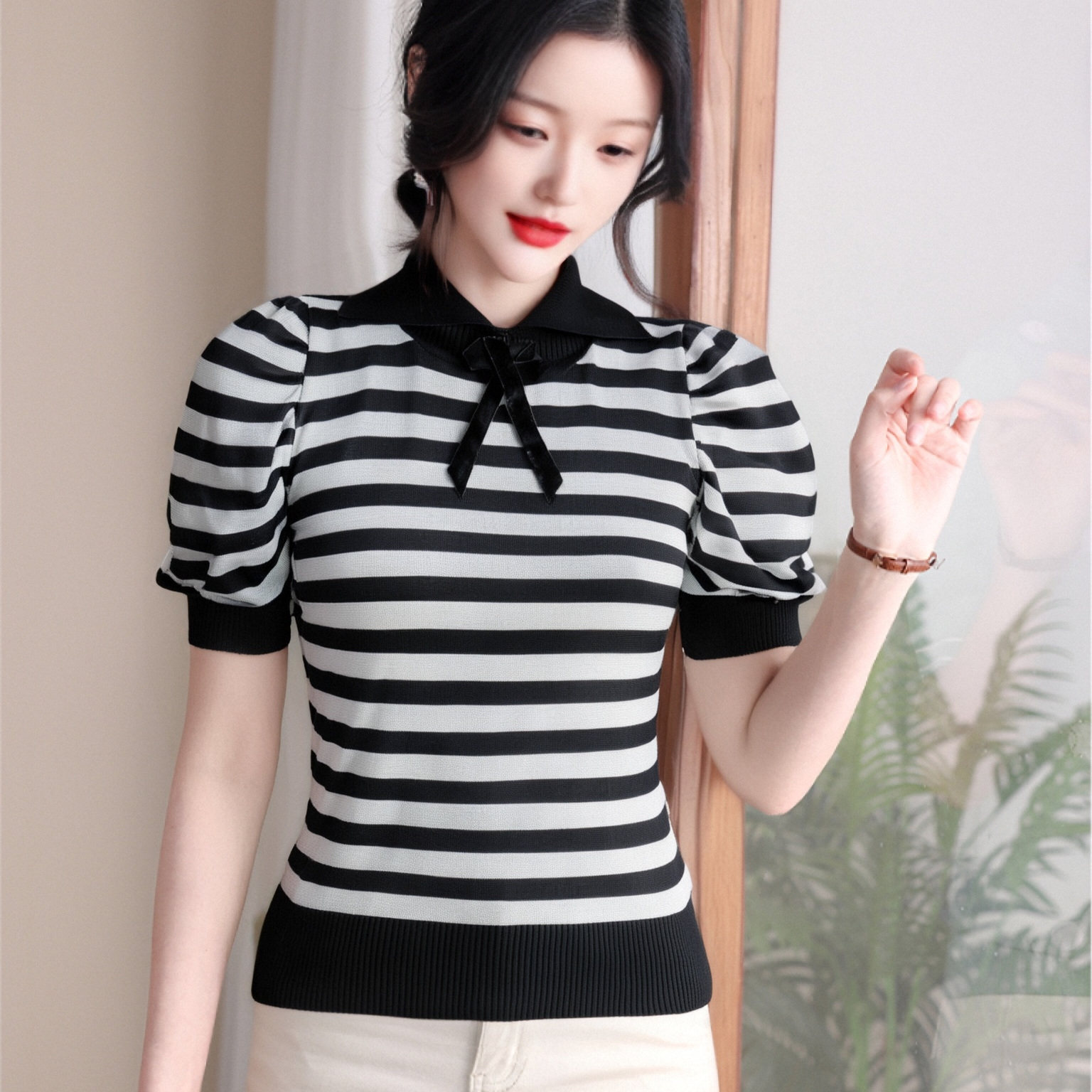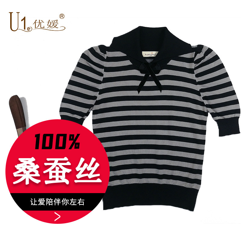 优媛昊艺夏款真丝桑蚕丝针织衫条纹休闲减龄蝴蝶结中袖套头上衣女