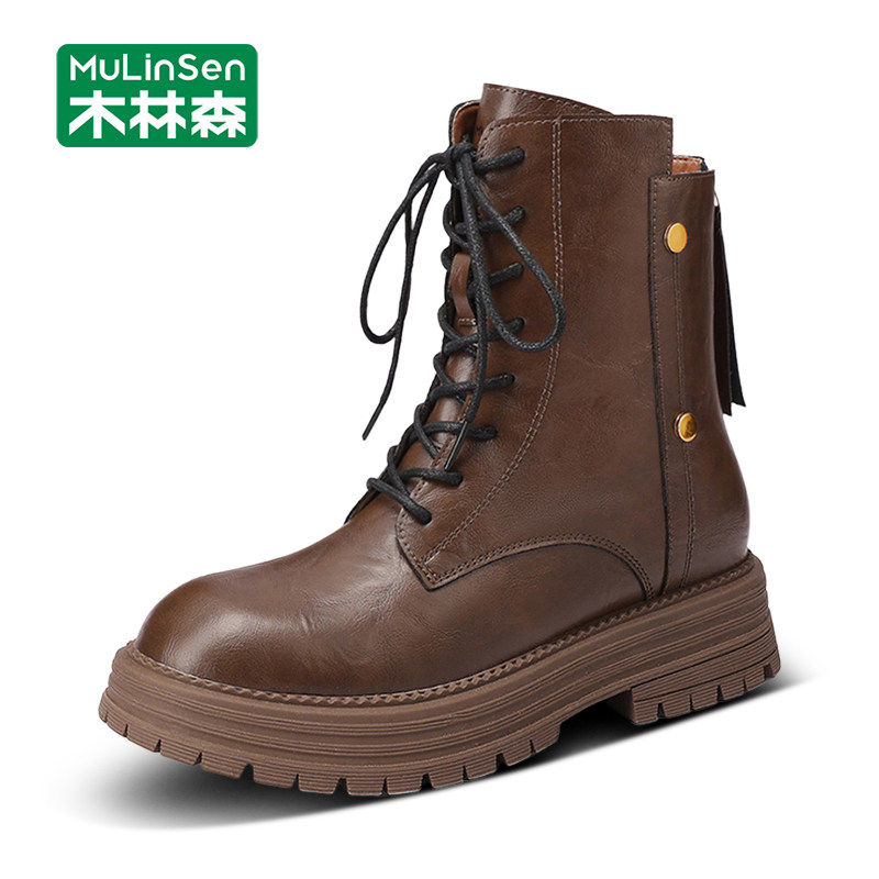 木林森马丁靴女2025新款冬季棕色厚底增高真皮复古英伦风百搭短靴