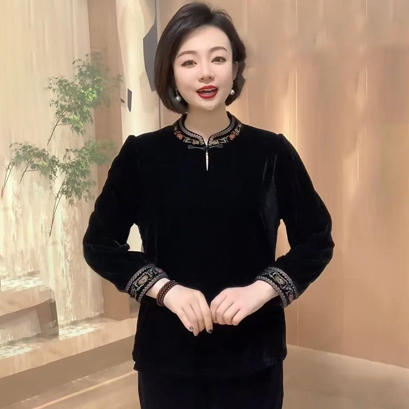 高贵洋气妈妈金丝绒上衣女2025秋冬新款复古气质立领刺绣打底小衫
