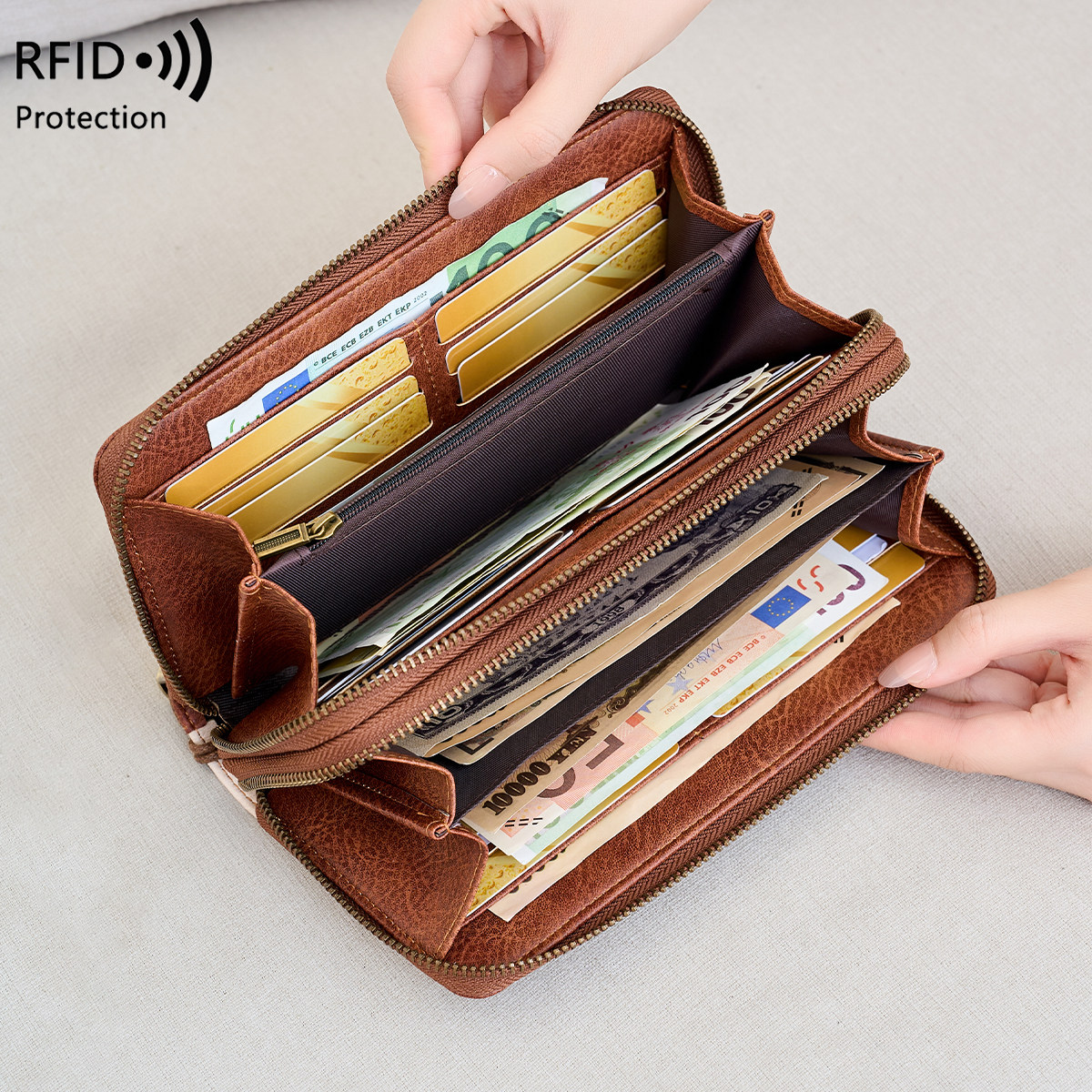 米印女士钱包RFID防盗刷撞色长钱包复古高级感大容量男士手拿包