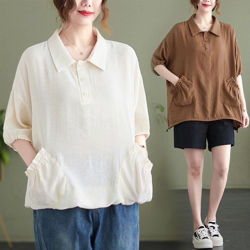 大码女装夏装胖MM文艺复古拼接大口袋短袖衬衫气质百搭polo领上衣