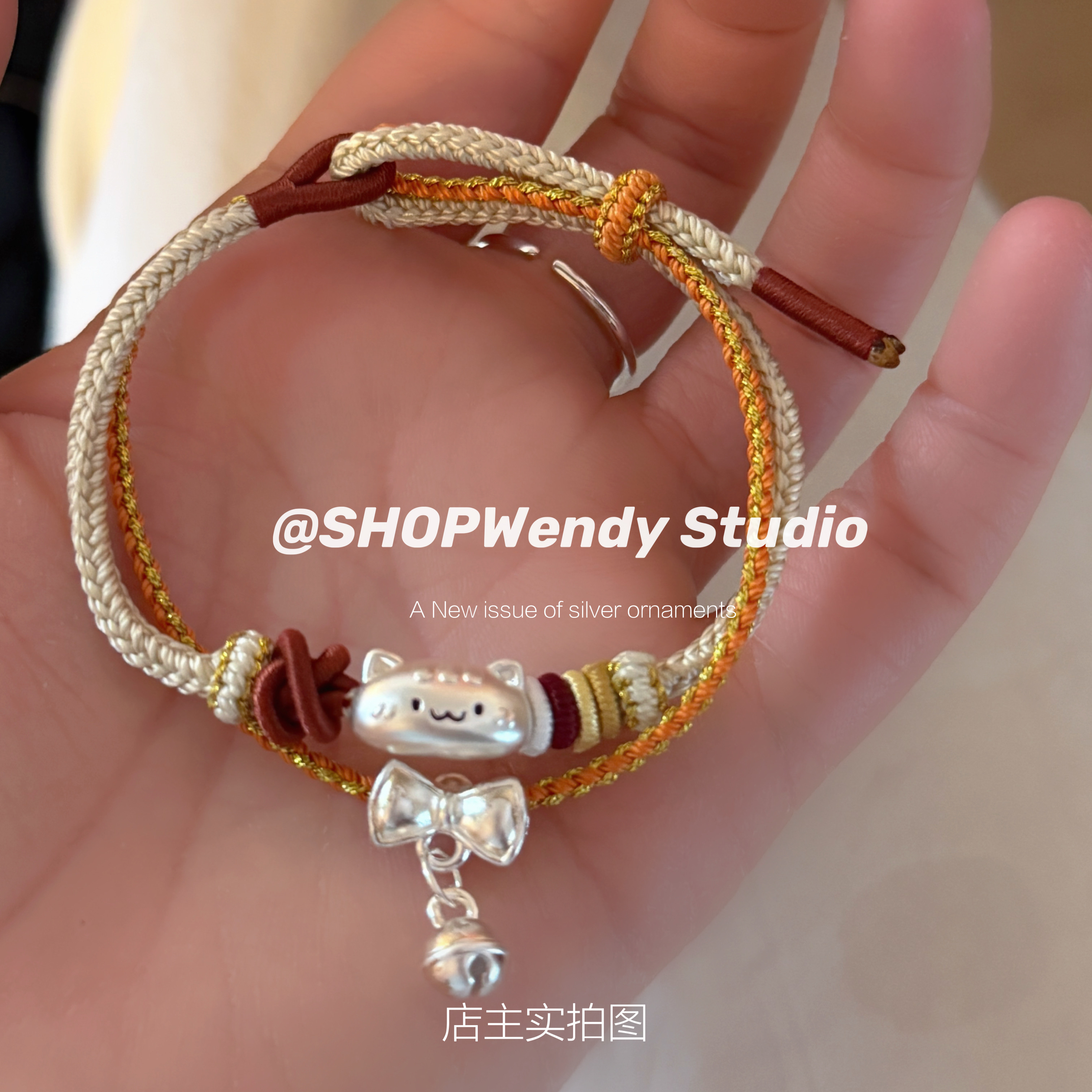 SHOPWendy | 足银999可爱法棍猫纯银蝴蝶结铃铛编织双层手绳