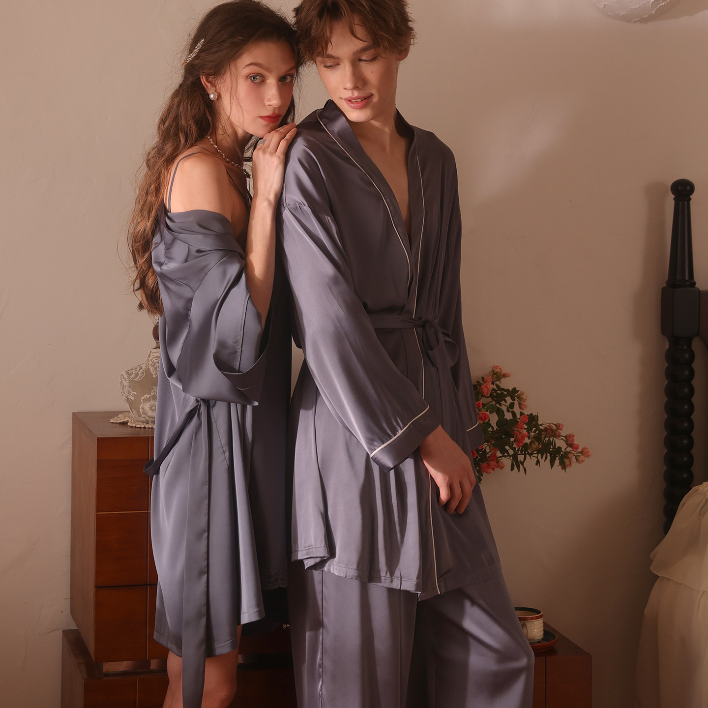 今夕何夕情侣睡衣秋冬女性感吊带睡裙睡袍套装高级感冰丝男家居服