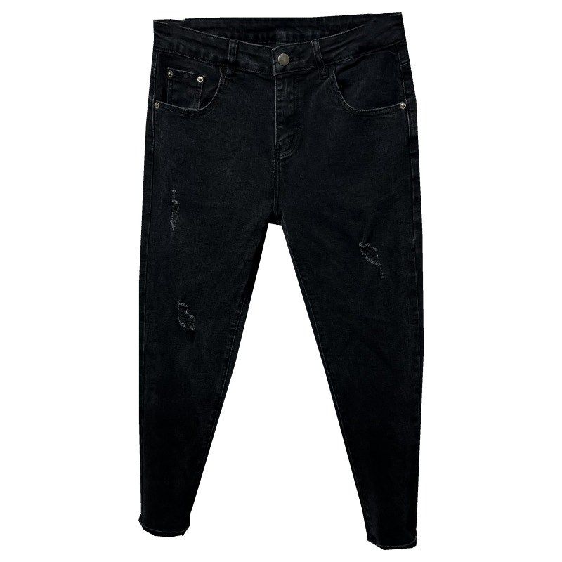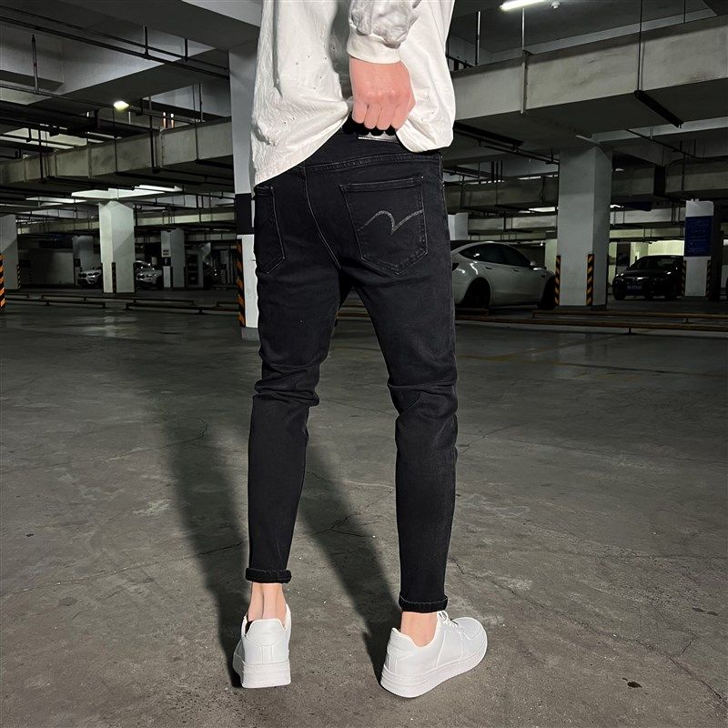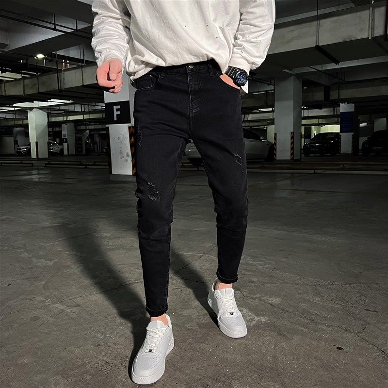 黑色破洞刮烂修身九分牛仔男裤2023春夏中腰水洗弹力男裤潮流百搭