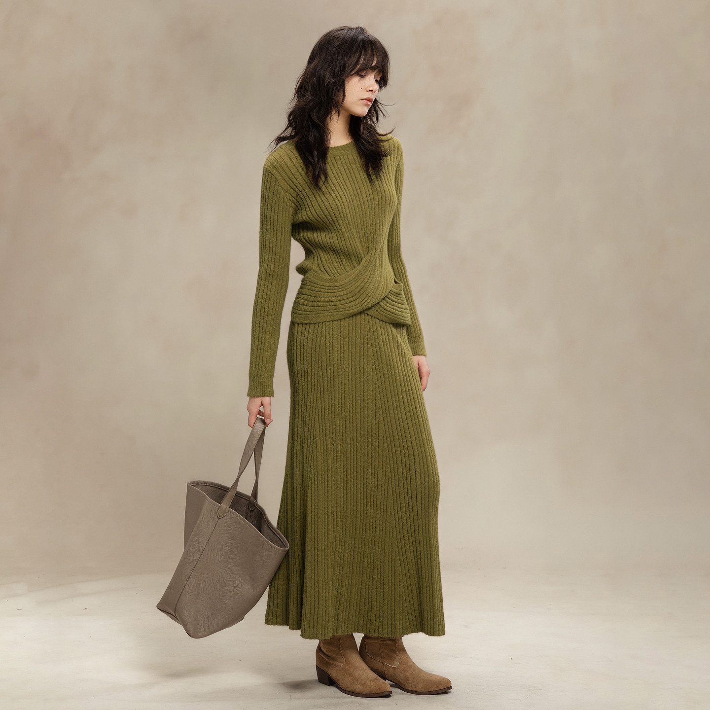 德玛纳优雅坑条针织套装女25冬季新款扭结收腰上衣鱼尾半裙两件套