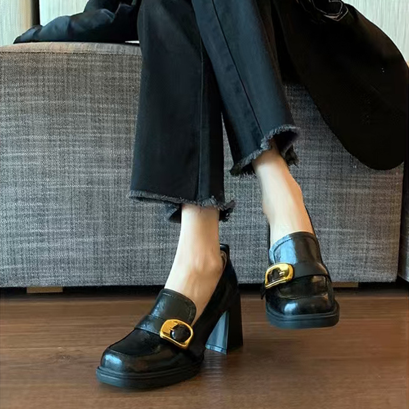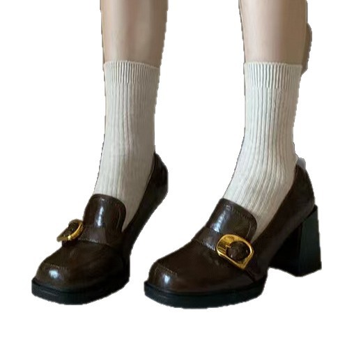2025年春夏新款方头高跟乐福鞋女英伦风jk女鞋子粗跟一脚蹬小皮鞋
