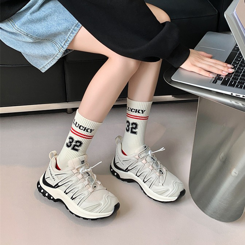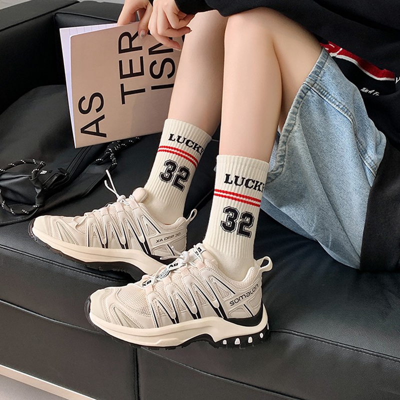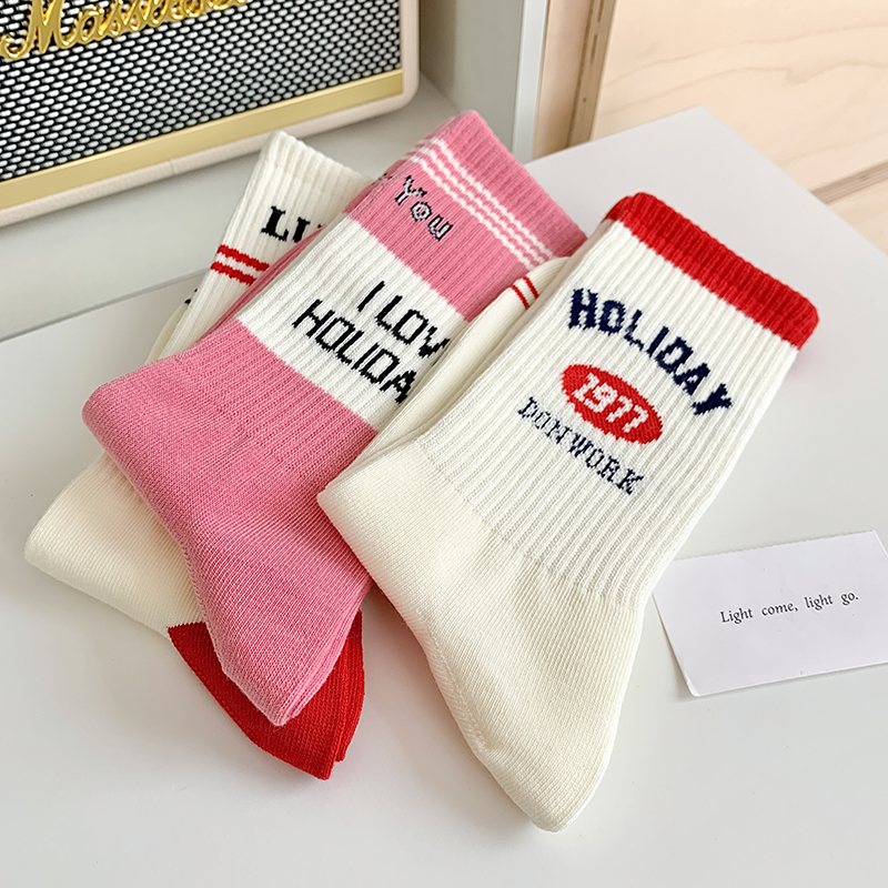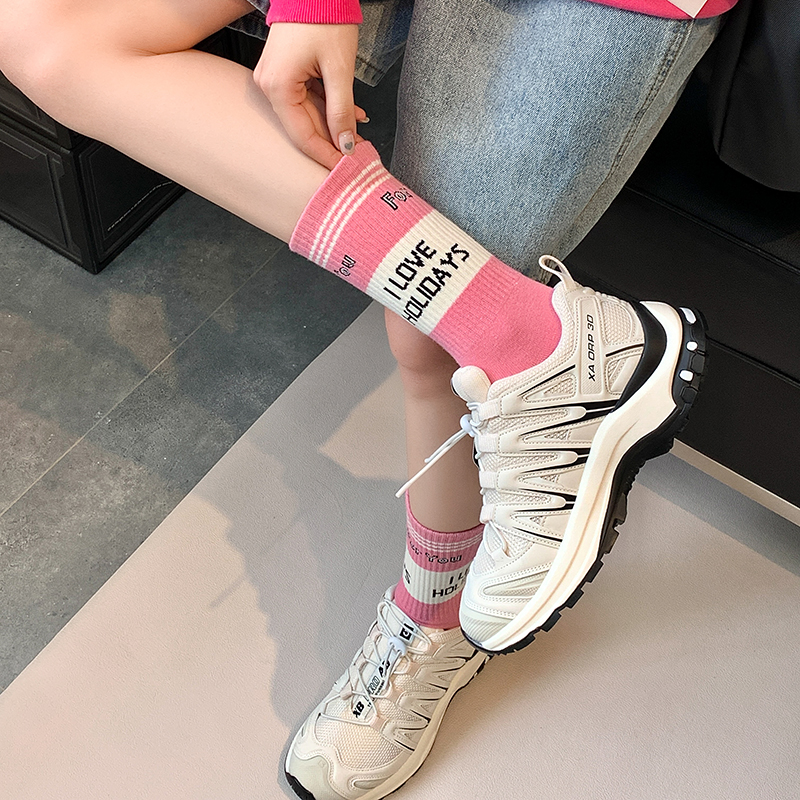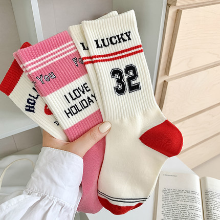 字母粉红色少女中筒袜ins潮外穿街头运动春秋纯棉日系长袜子秋冬