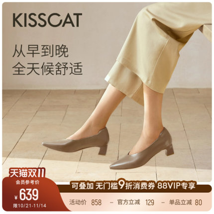 KISSCAT接吻猫[CAT猫掌奶奶鞋]尖头单鞋裸色高跟鞋气质真皮不累脚