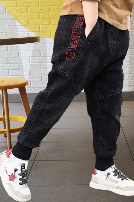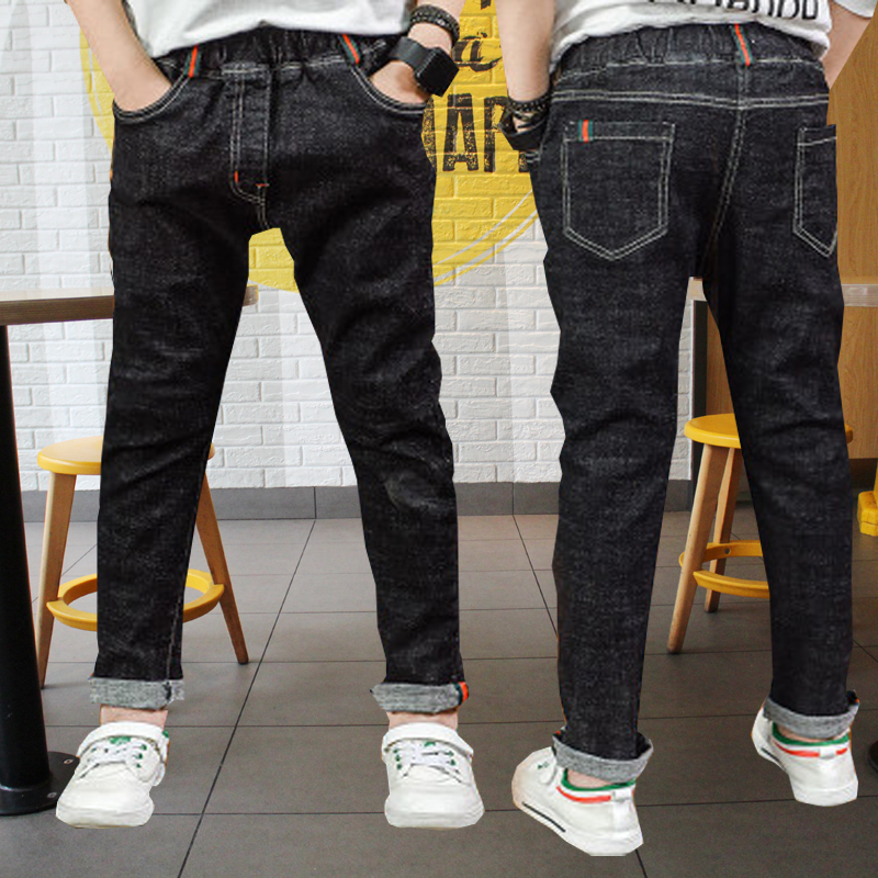 男童牛仔裤秋冬款加绒加厚中大童修身格子长裤弹力小脚裤韩版潮