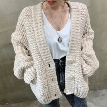 韩国chic早秋温柔风大纽扣宽松百搭长袖中长款开衫针织毛衣外套女