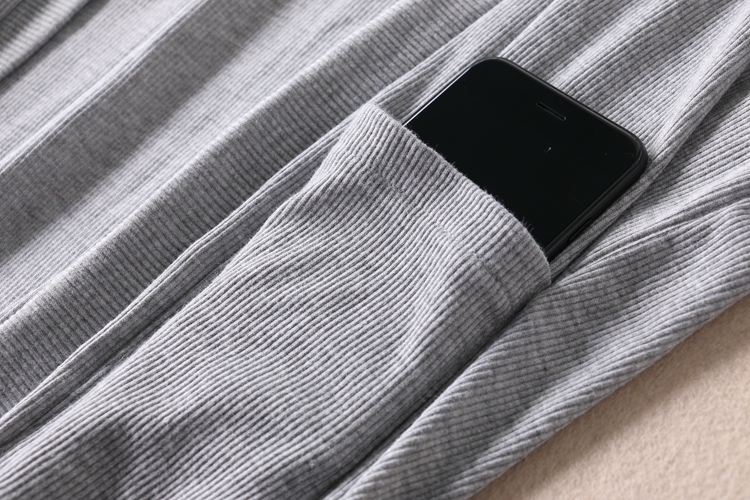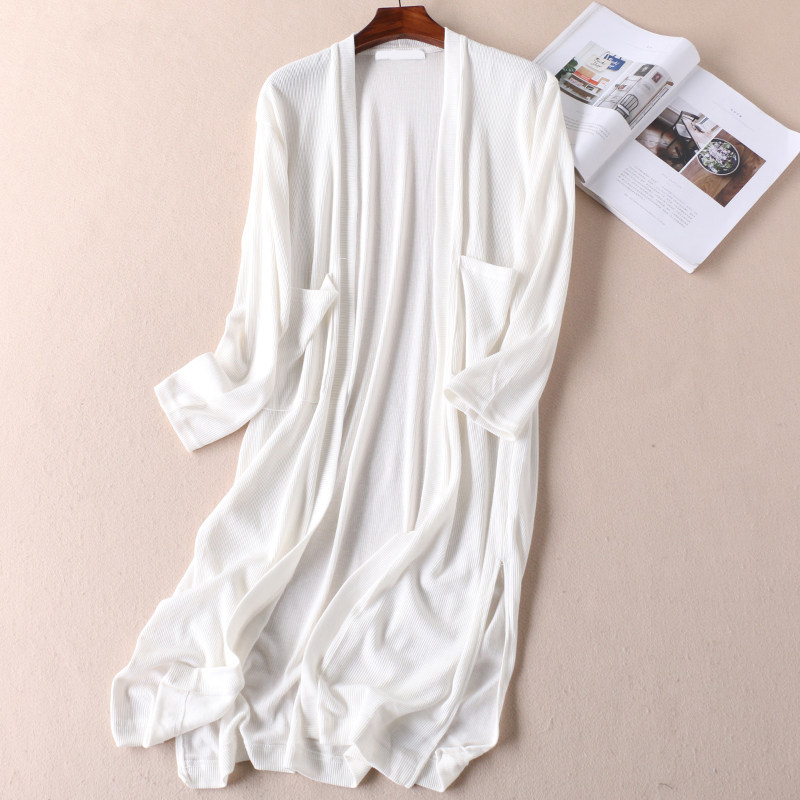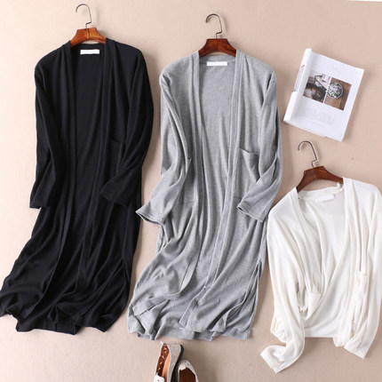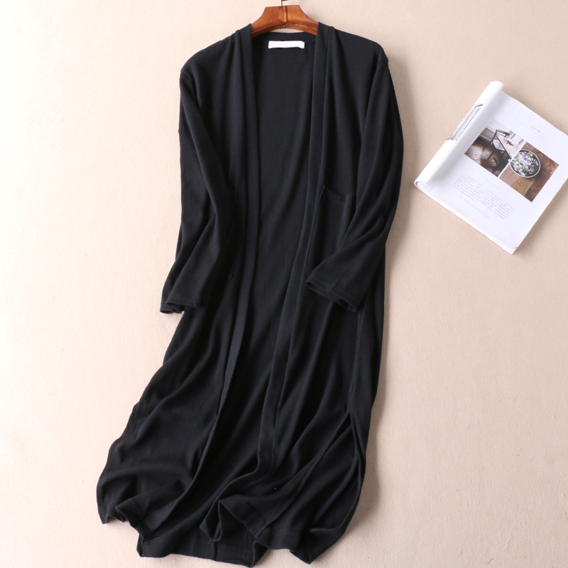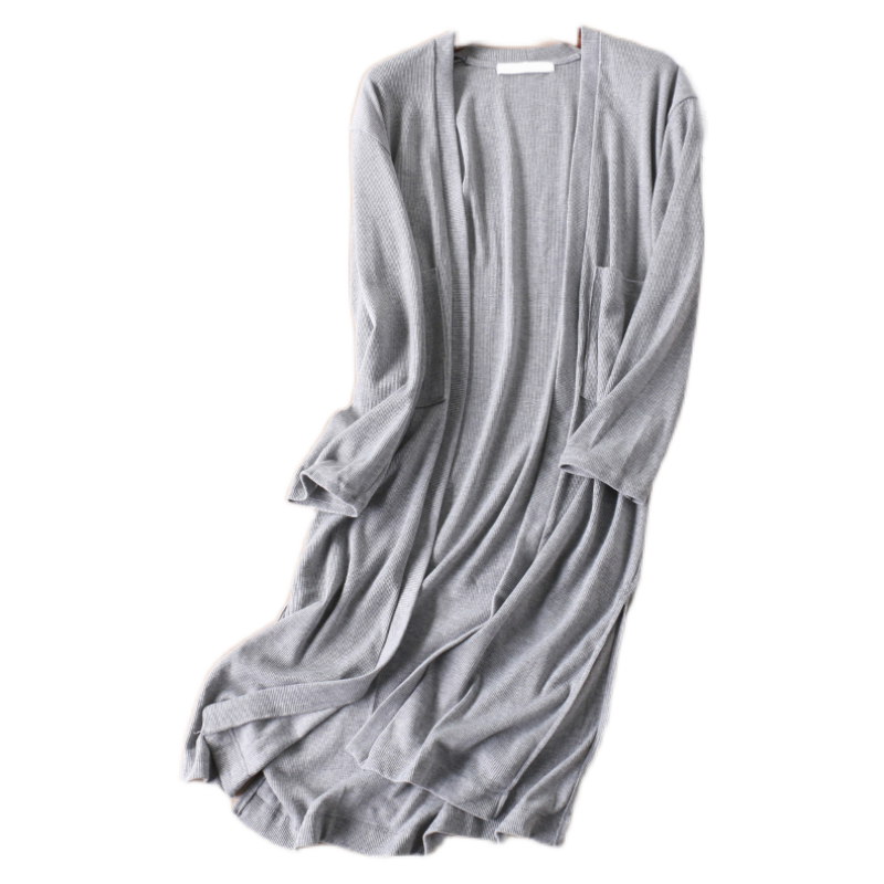 外贸~中长款针织开衫女 无扣长袖V领双口袋披肩薄外套 D673