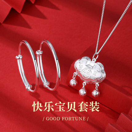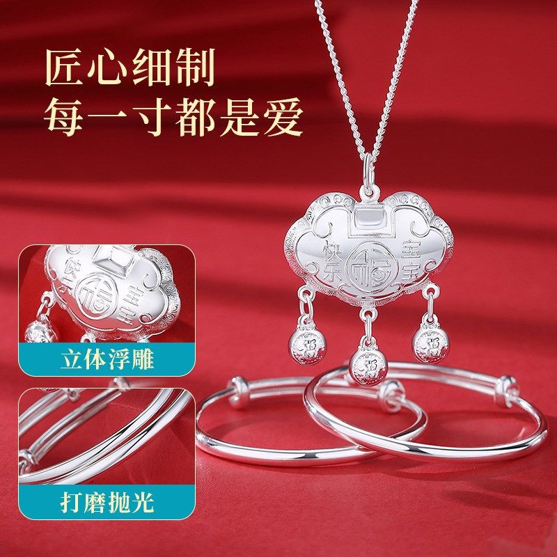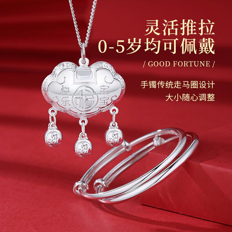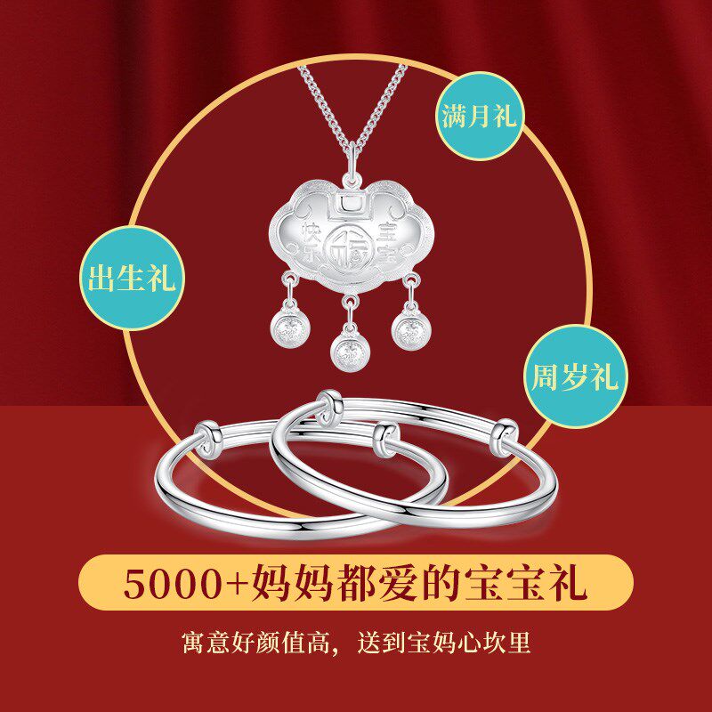 宝宝银手镯999纯银长命锁儿童银锁小孩男女婴儿满月礼物银饰镯子