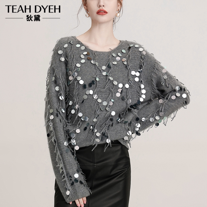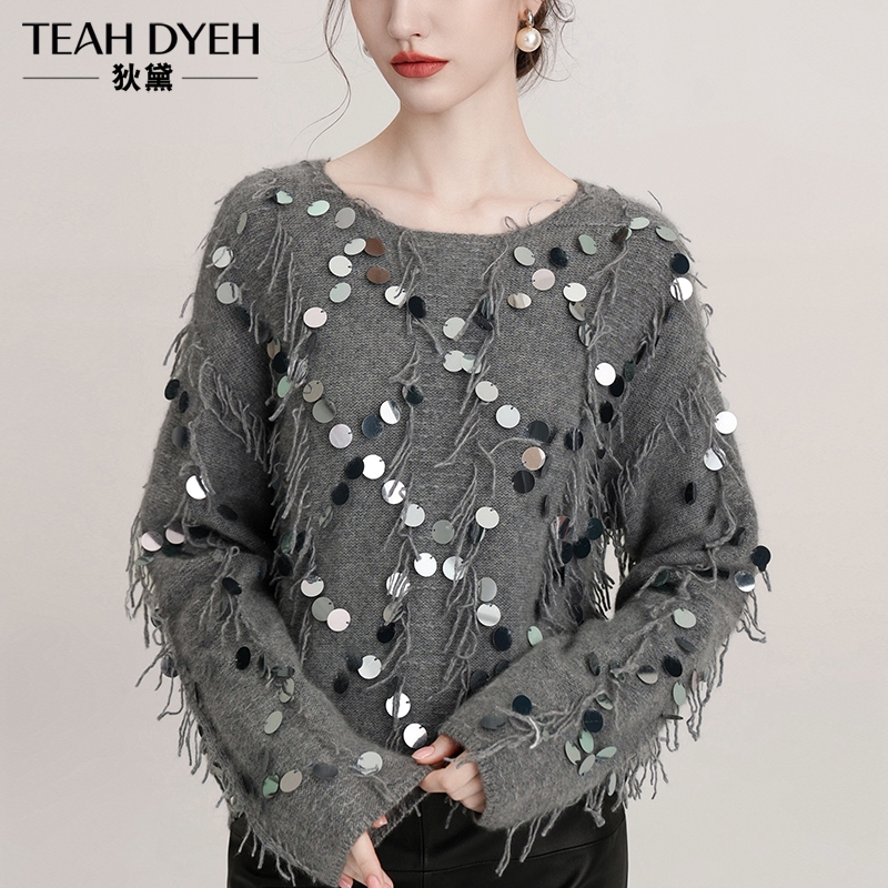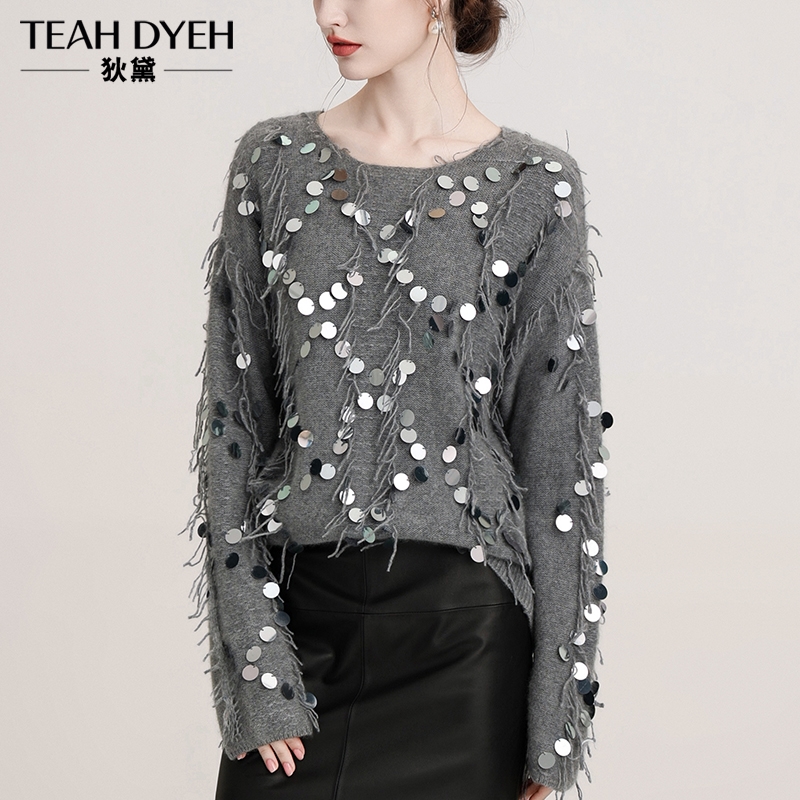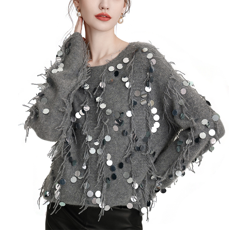 流苏亮片灰色纯羊绒针织衫毛衣冬