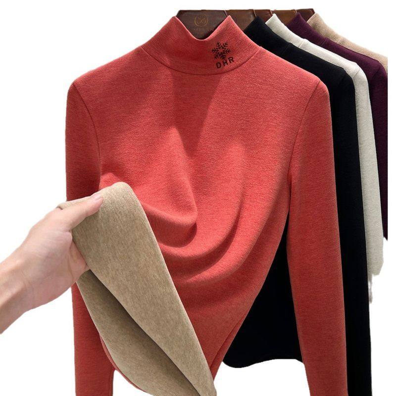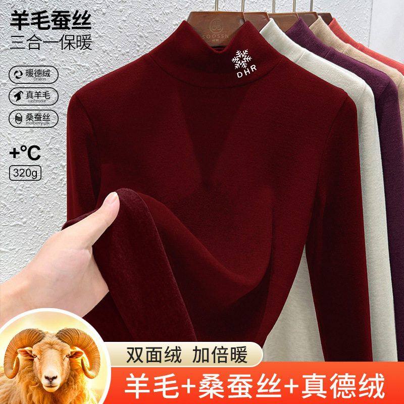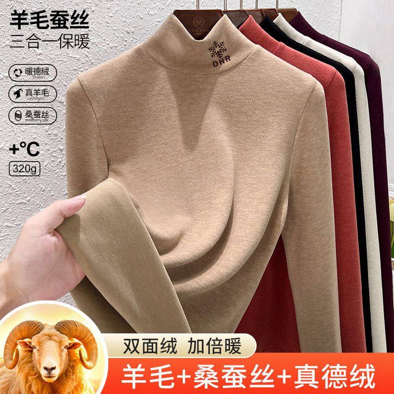 羊毛蚕丝德绒高领打底衫秋衣女发热内衣中高领保暖绣花上衣冬季HD