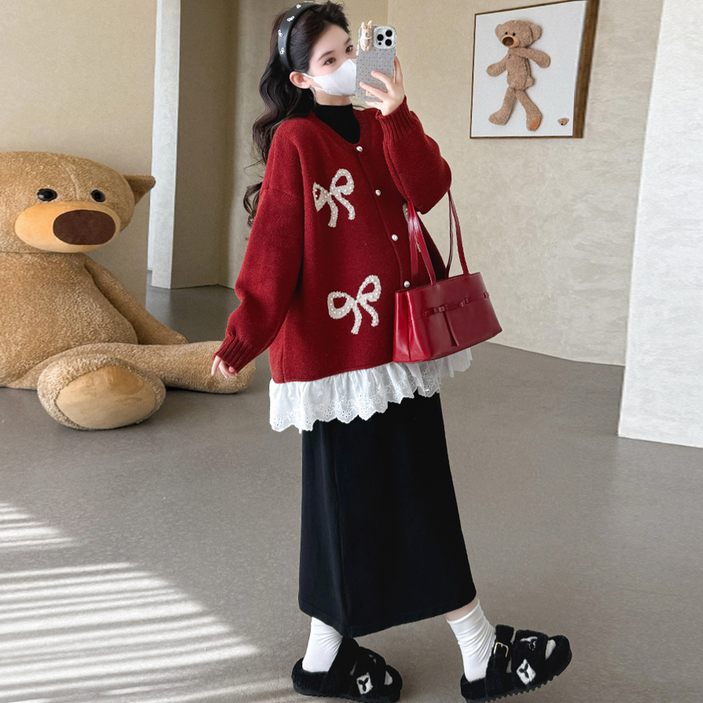 孕妇连衣裙红色套装秋冬2025新款加厚针织毛衣外套打底裙两件套女