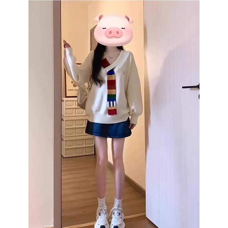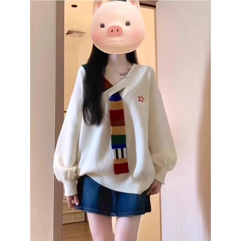 美式复古彩虹毛织拼接v领针织衫外套秋宽松学院风高级感女毛衣冬