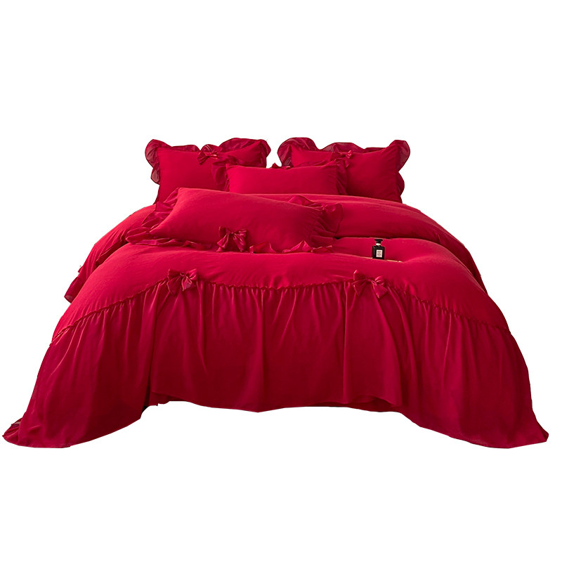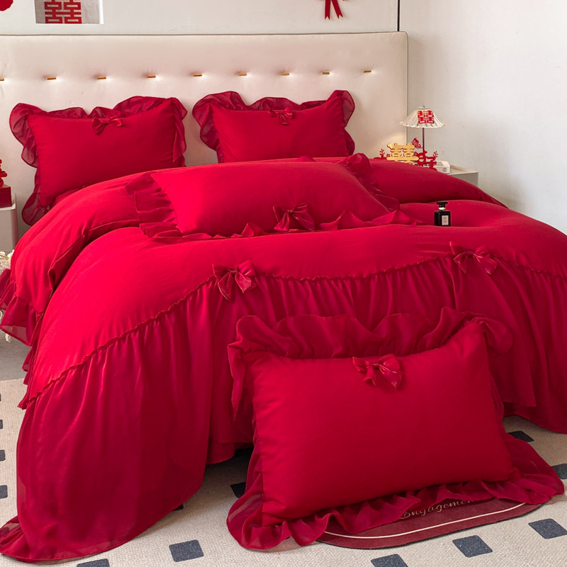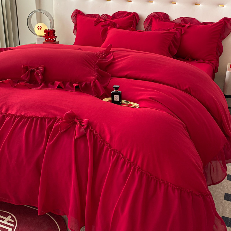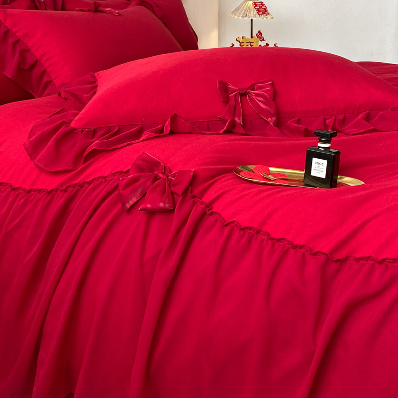 简约全棉结婚四件套大红色备婚床单被套公主婚庆床上用品婚房