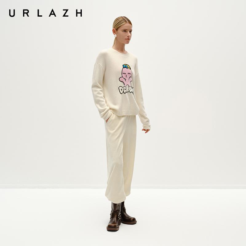 URLAZH有兰冬季新款米白色萌趣亲亲龙圆领宽松羊绒针织套头毛衣女