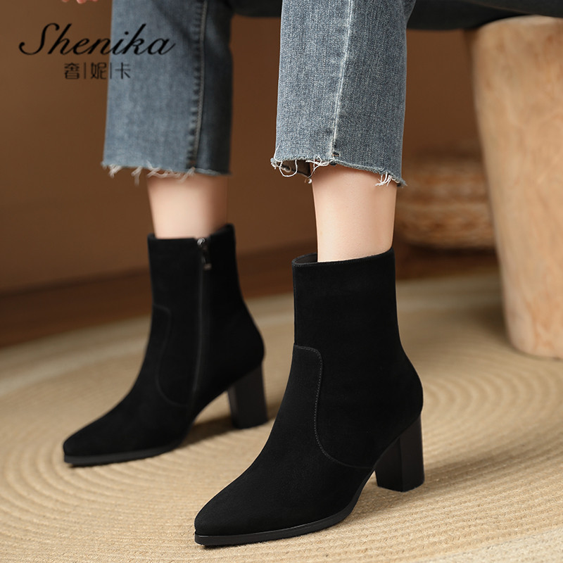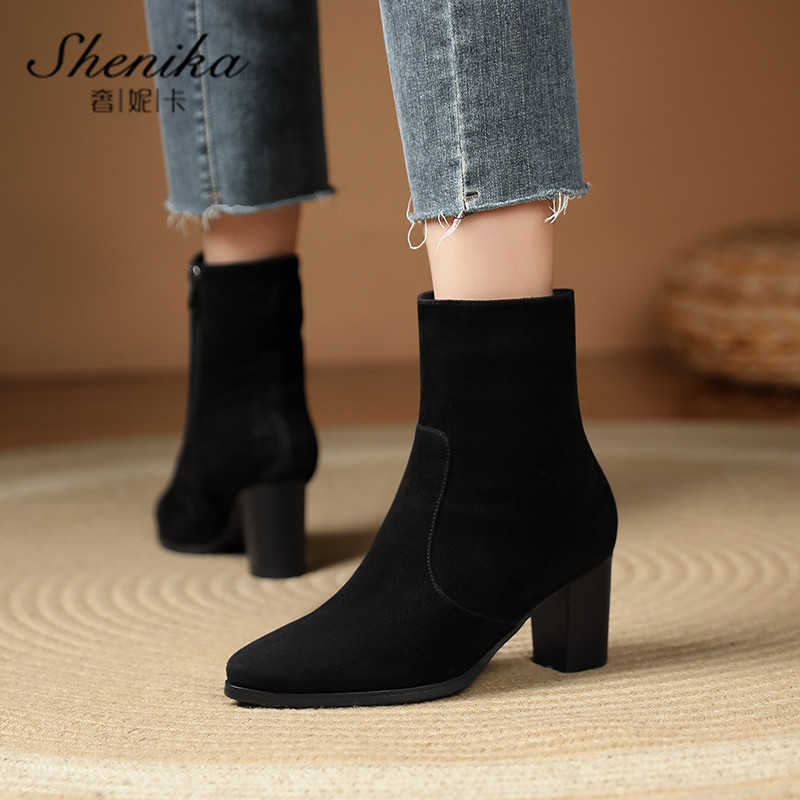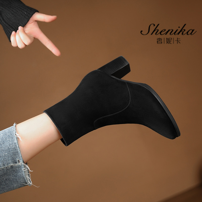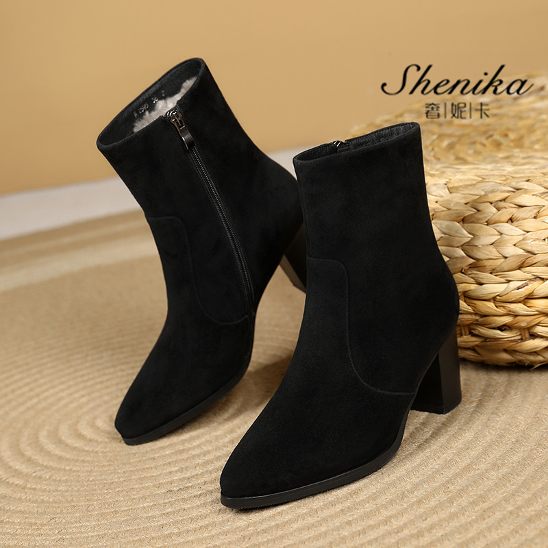 高跟马丁靴女冬新款加厚羊猄软皮短靴女粗跟皮毛一体保暖雪地靴