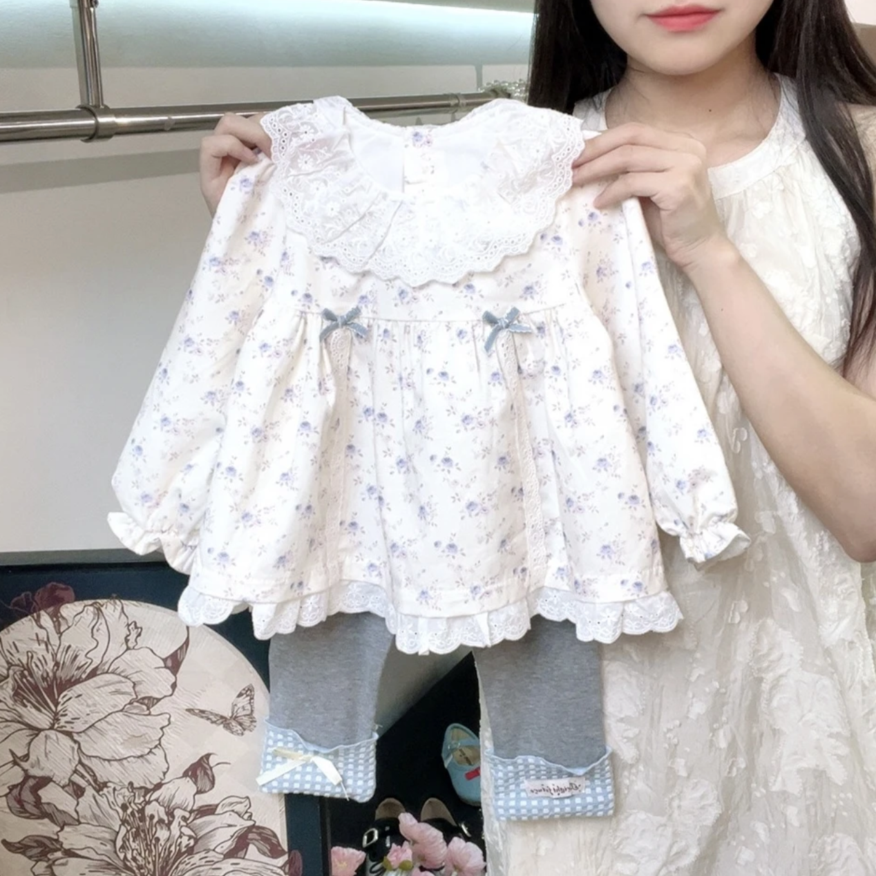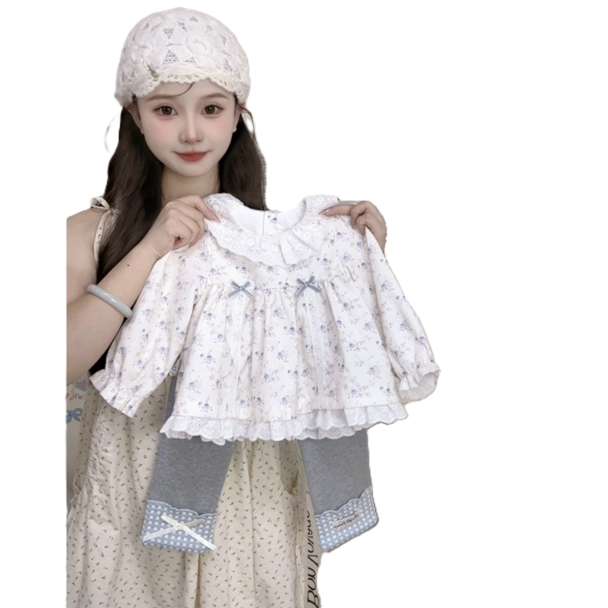 女童衬衫套装2025秋季新款女宝森系花边碎花娃娃衫打底裤洋气套装