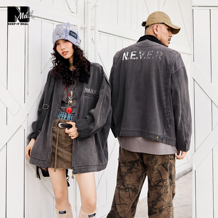 NMAX大码潮牌男装秋新品领口拼接翻领牛仔衣复古做旧短款夹克外套