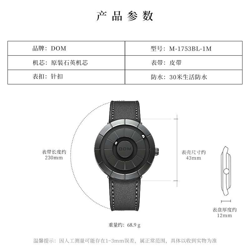 DOM腕表坚守139道生产工序个性黑科技磁力皮带男士手表M-1753BL