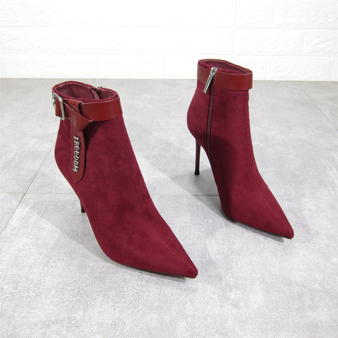 显瘦百搭酒红色加绒女靴2024秋冬新款尖头细跟高跟短靴侧拉链装饰