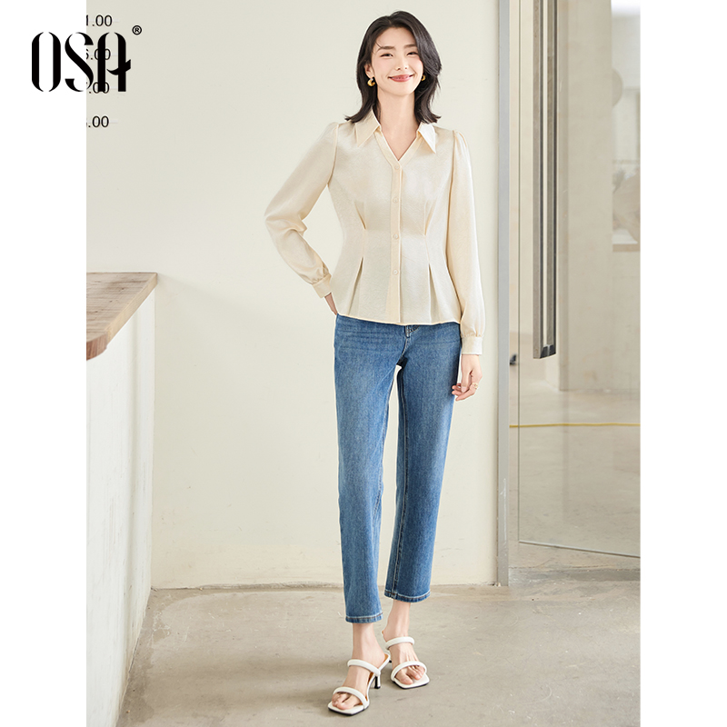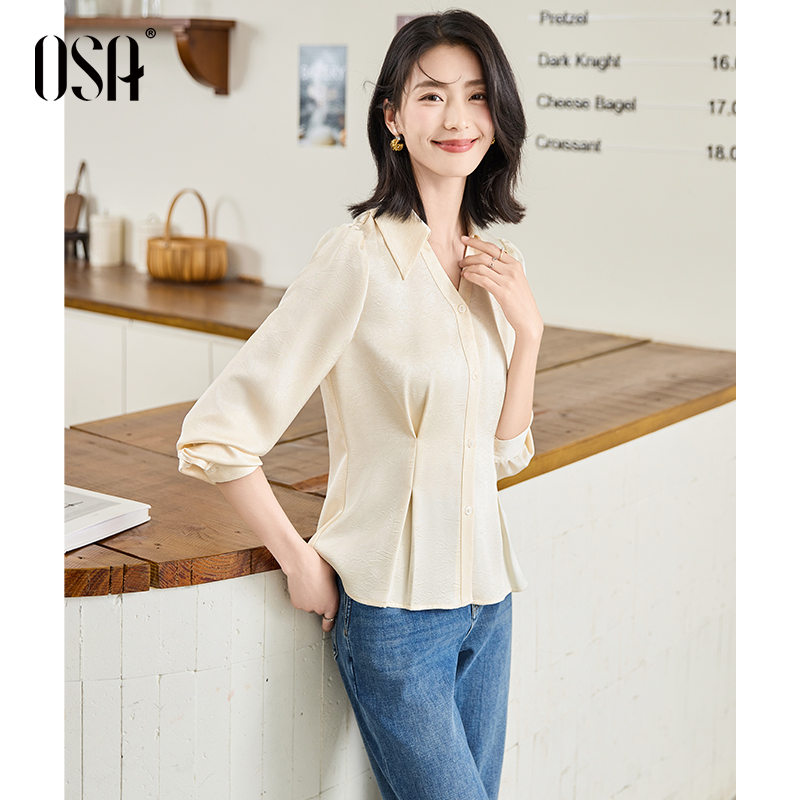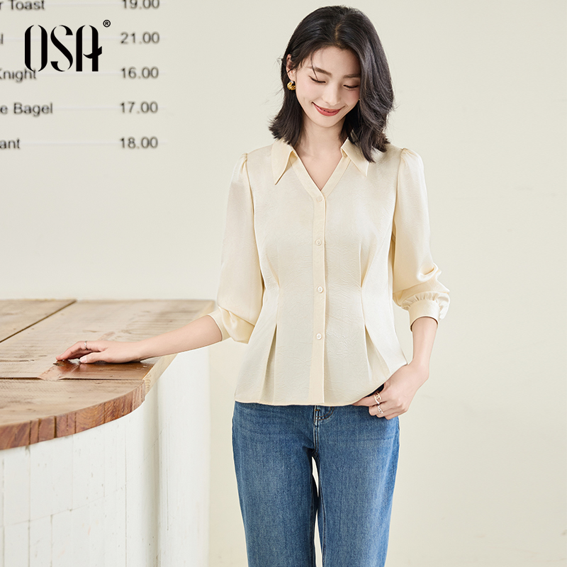 OSA欧莎法式复古泡泡袖衬衫女士收腰修身长袖设计感衬衣2025新款