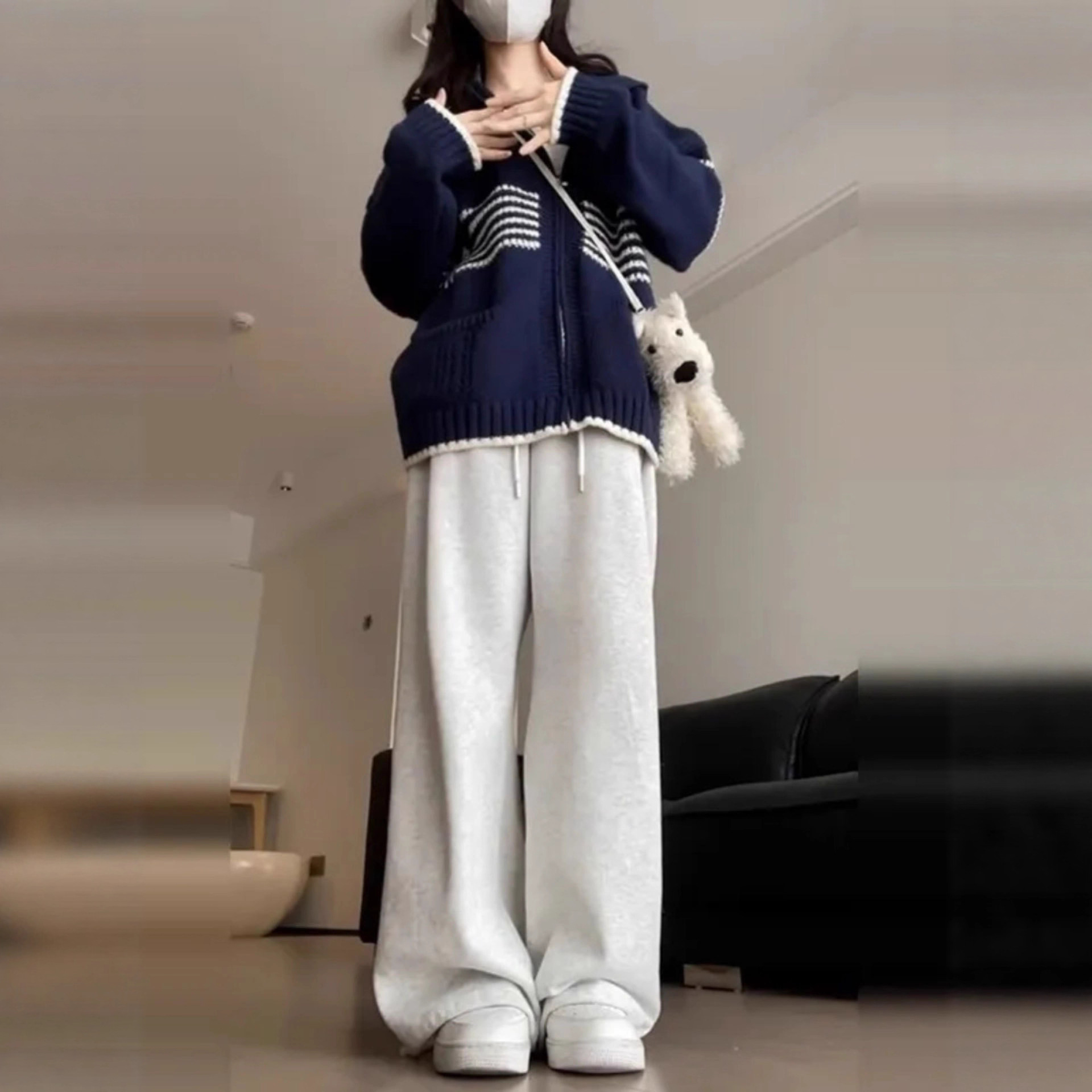 港风chic连帽针织开衫毛衣外套女秋冬宽松软糯条纹学院慵懒风上衣