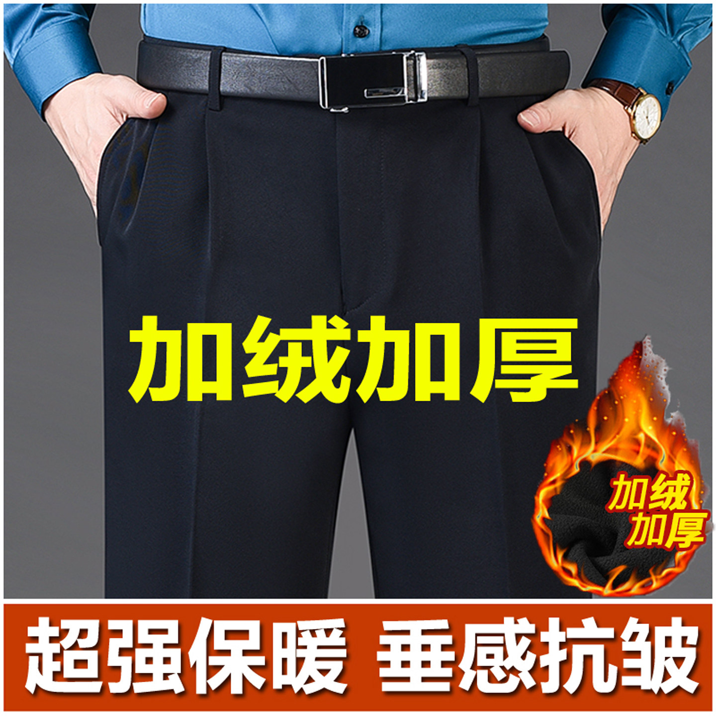 皮尔卡丹加绒西裤中老年双褶高腰宽松男裤冬季加厚保暖爸爸西装裤