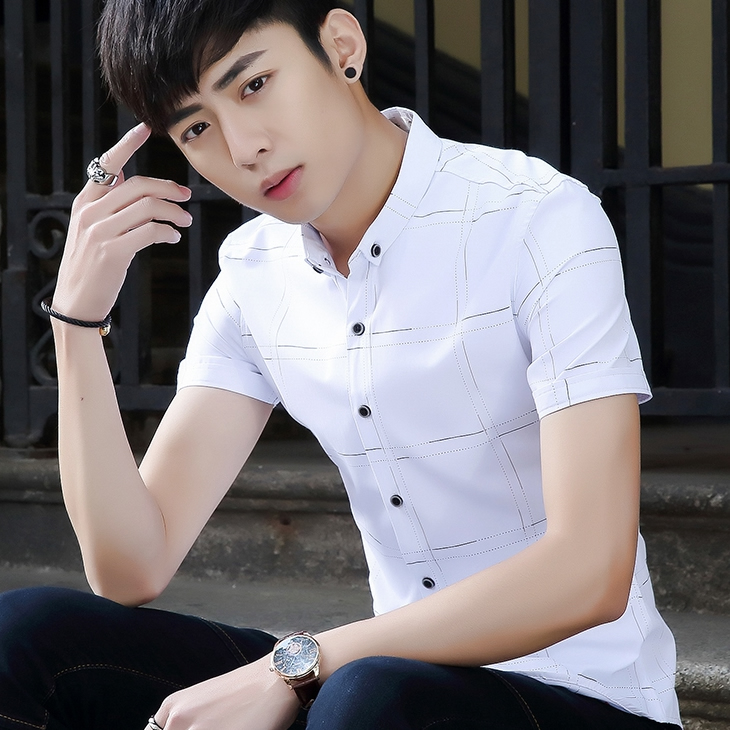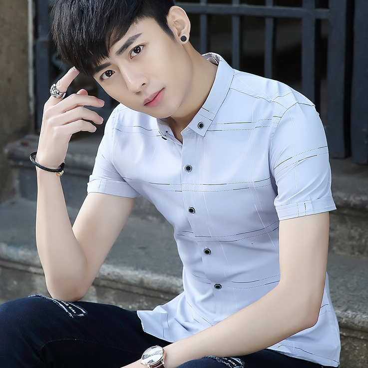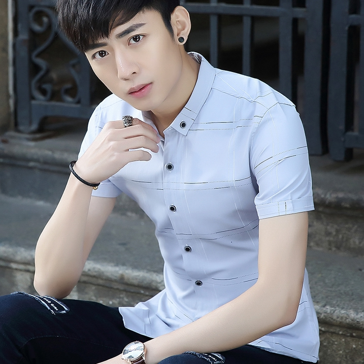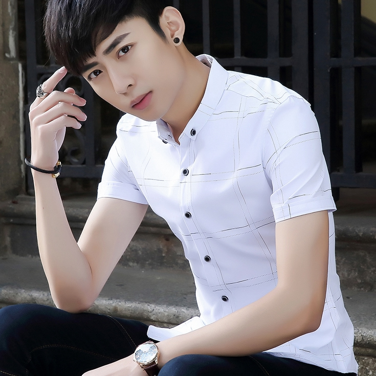 学生时尚男装修身韩版薄款流行衬衫短袖潮寸衫夏季学生半袖衬衣