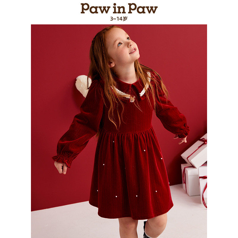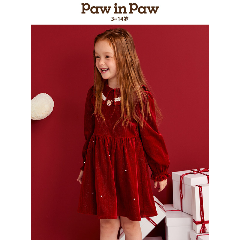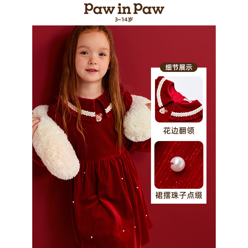 【天鹅绒】PawinPaw卡通小熊童装秋冬新款女童红色新年银丝连衣裙