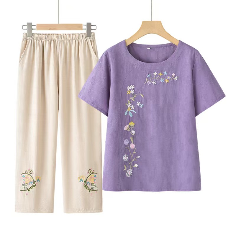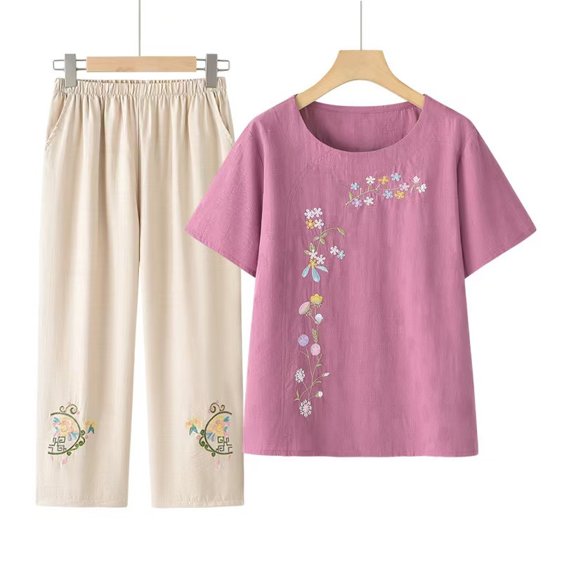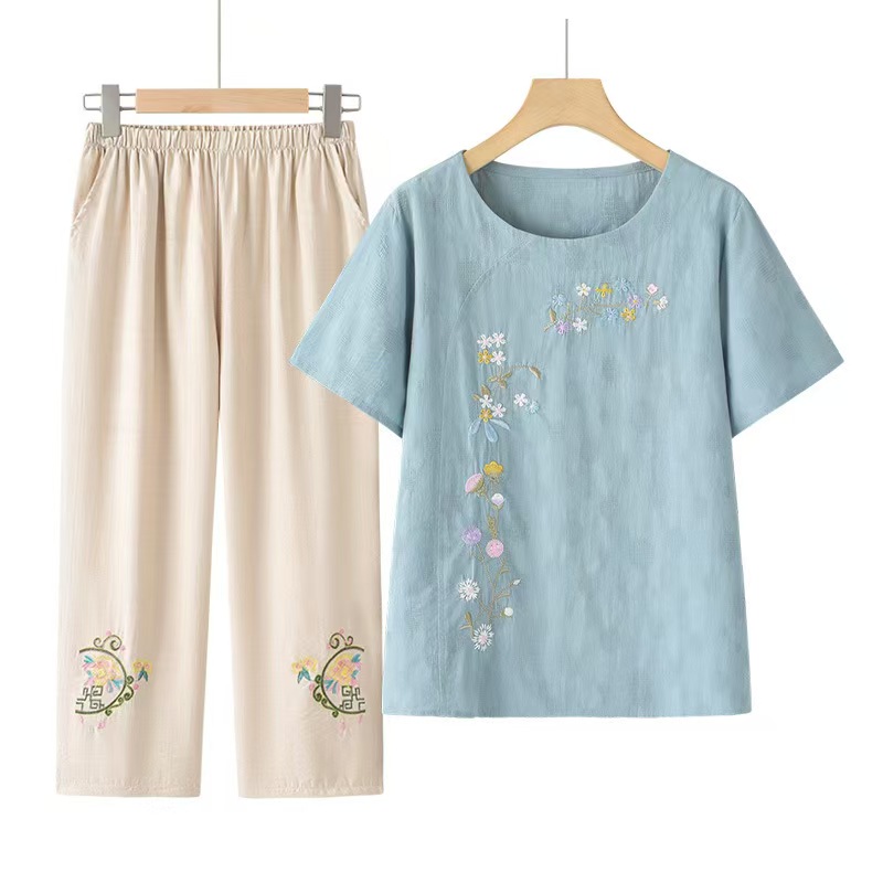 夏季新款中老年妈妈装短袖套装女奶奶装七分裤刺绣上衣棉麻奶奶装