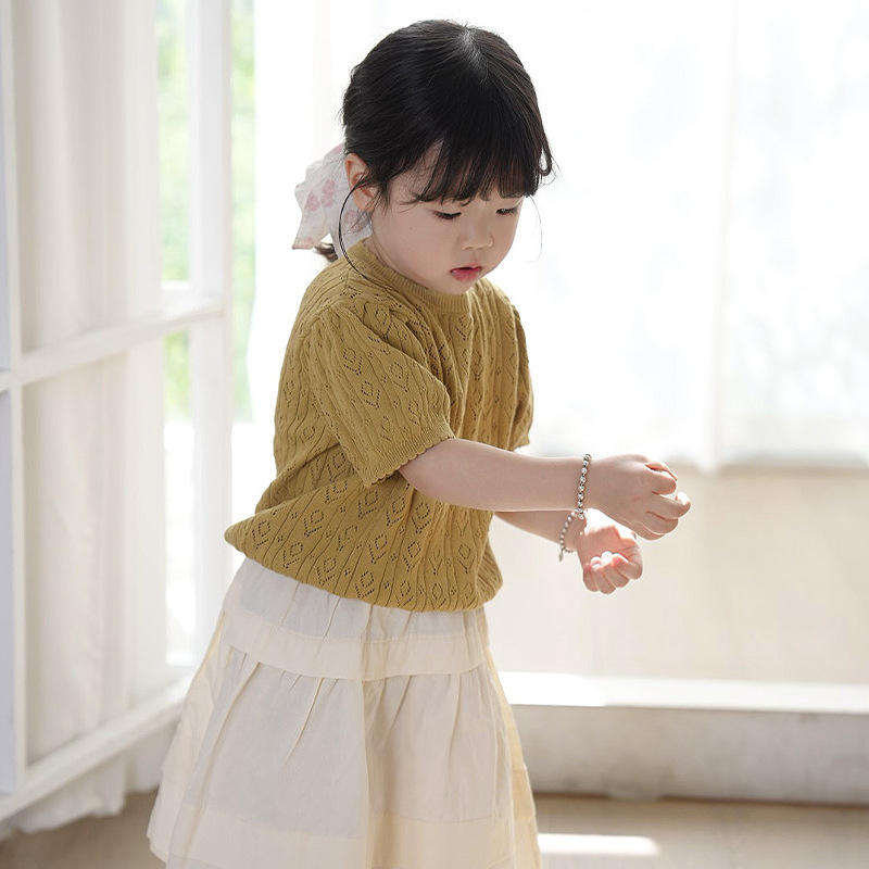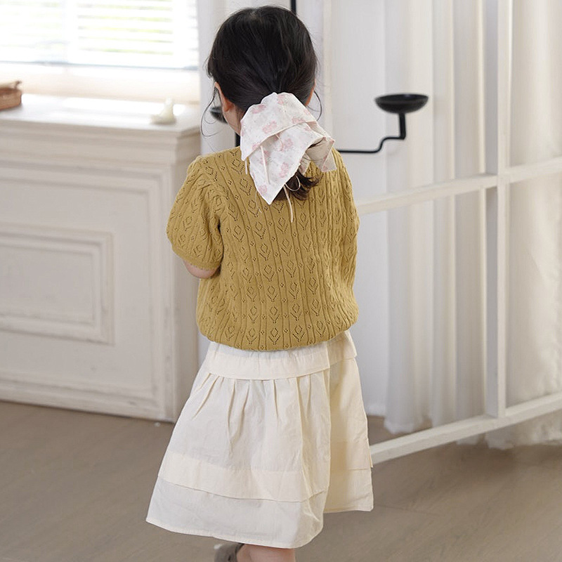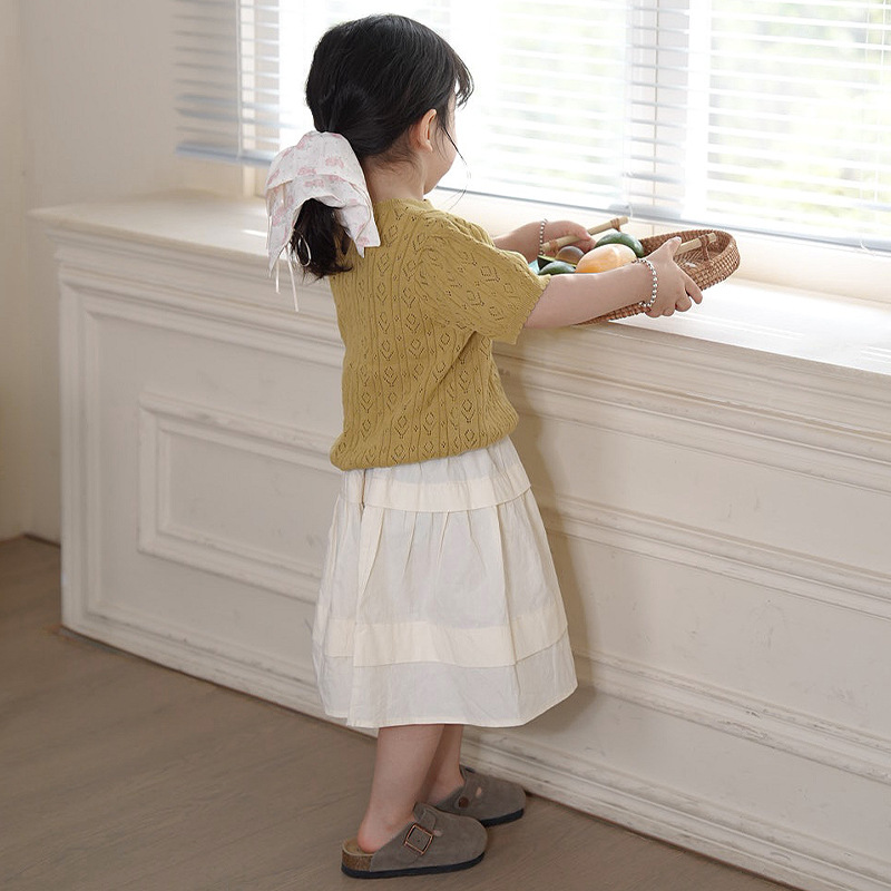 现货2025春夏LOU新款童装 女中小童棉芥黄针织衫+奶油半身裙套装