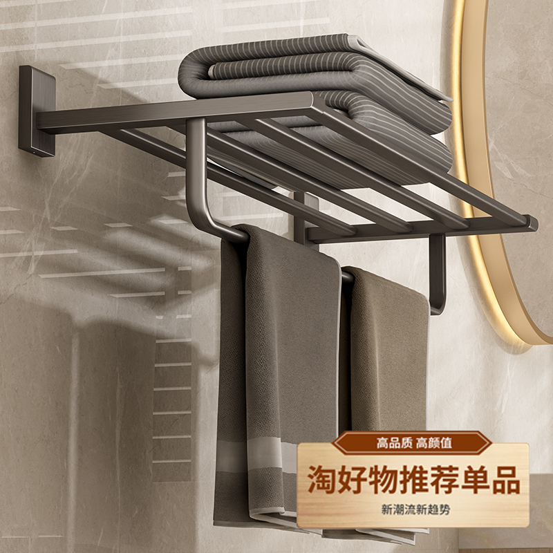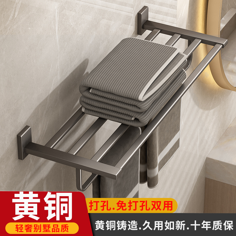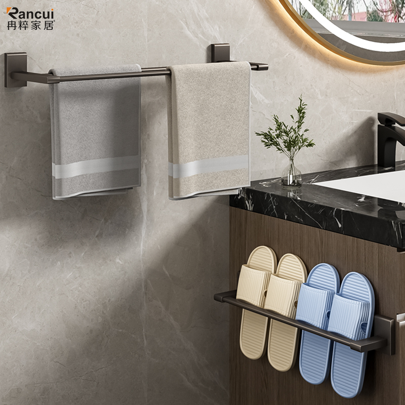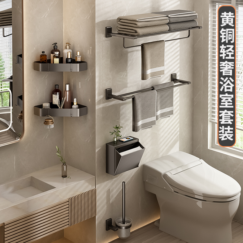 卫生间浴巾架枪灰色全铜毛巾架免打孔浴室置物架子洗澡间挂件套装