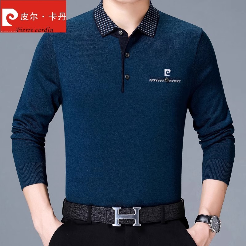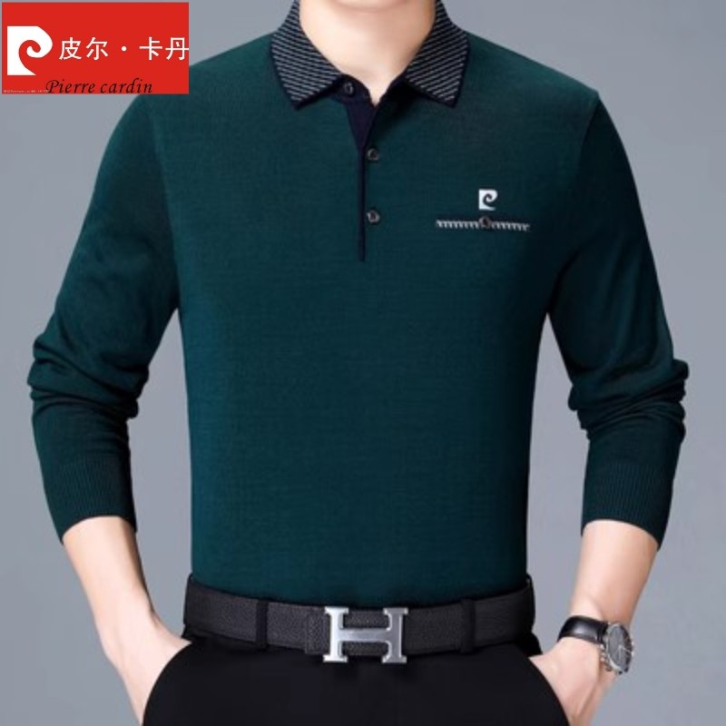 皮尔卡丹桑蚕丝长袖t恤男士春秋季新款爸爸装冰丝体恤翻领polo衫