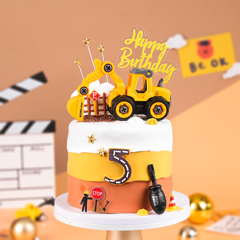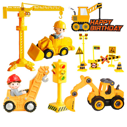 包邮男孩蛋糕装饰工程车挖掘机玩偶摆件塔吊路障标识插牌生日插件