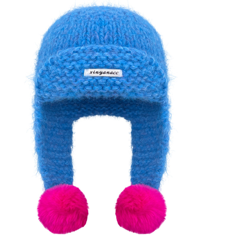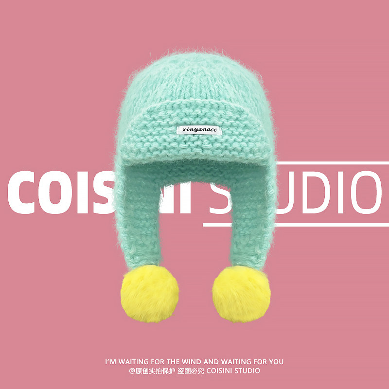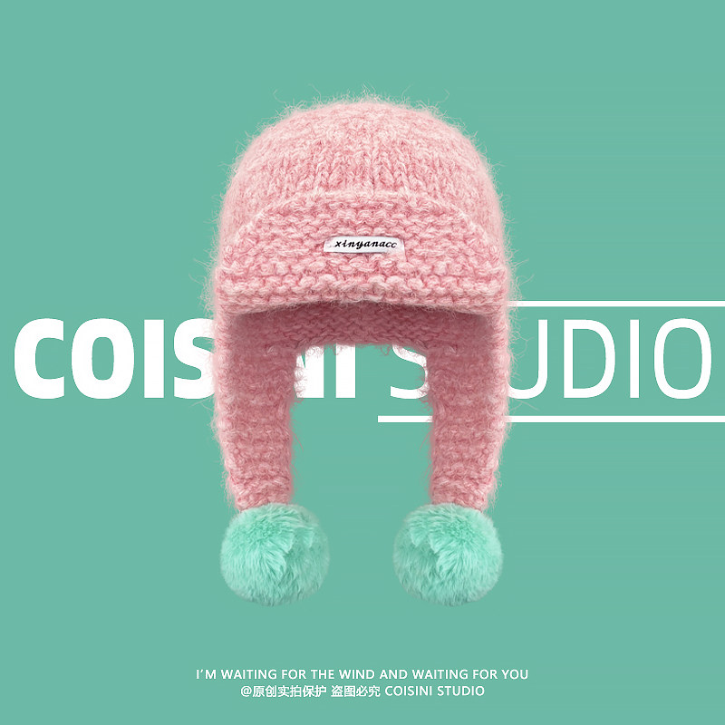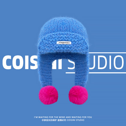 韩版多巴胺撞色针织毛线帽女秋冬加长毛球护耳保暖显脸小雷锋帽潮