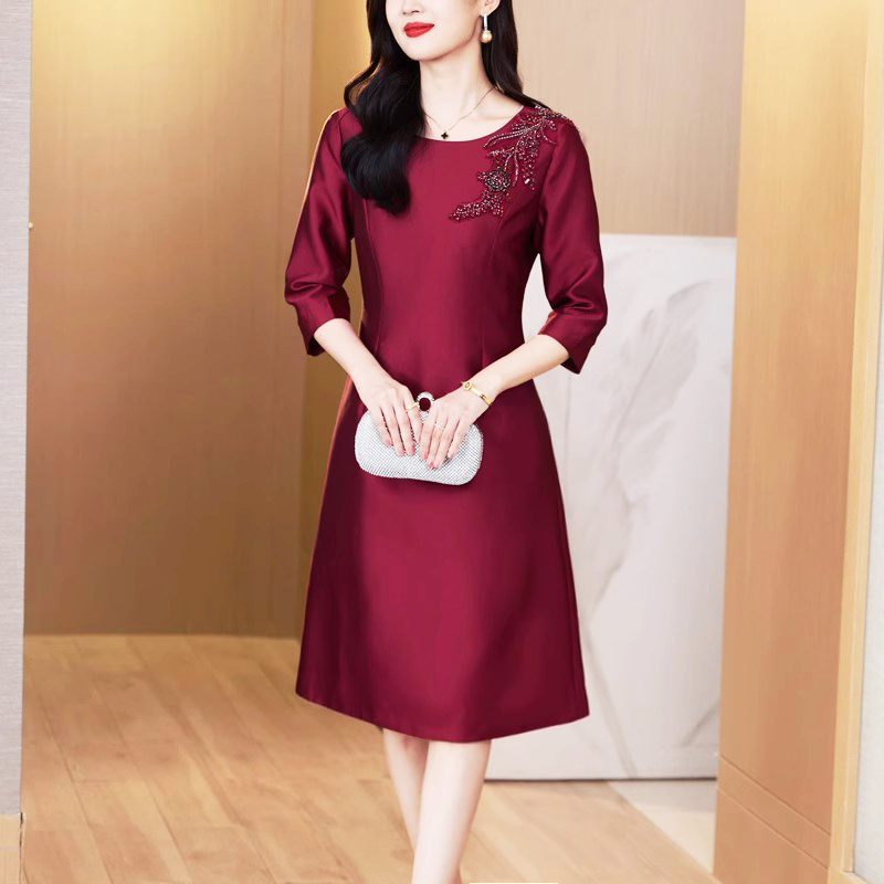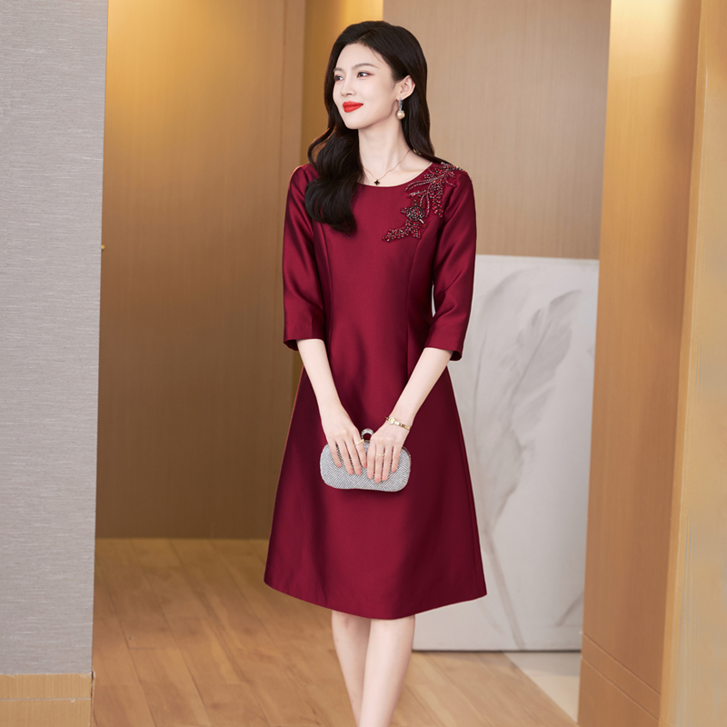酒红喜婆婆婚宴装连衣裙女2025年早秋新款高端名媛收腰显瘦A字裙