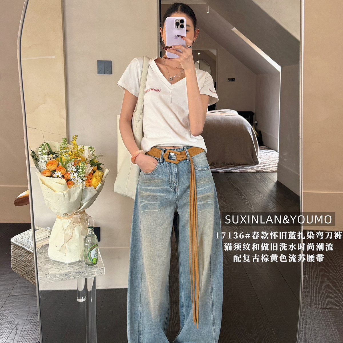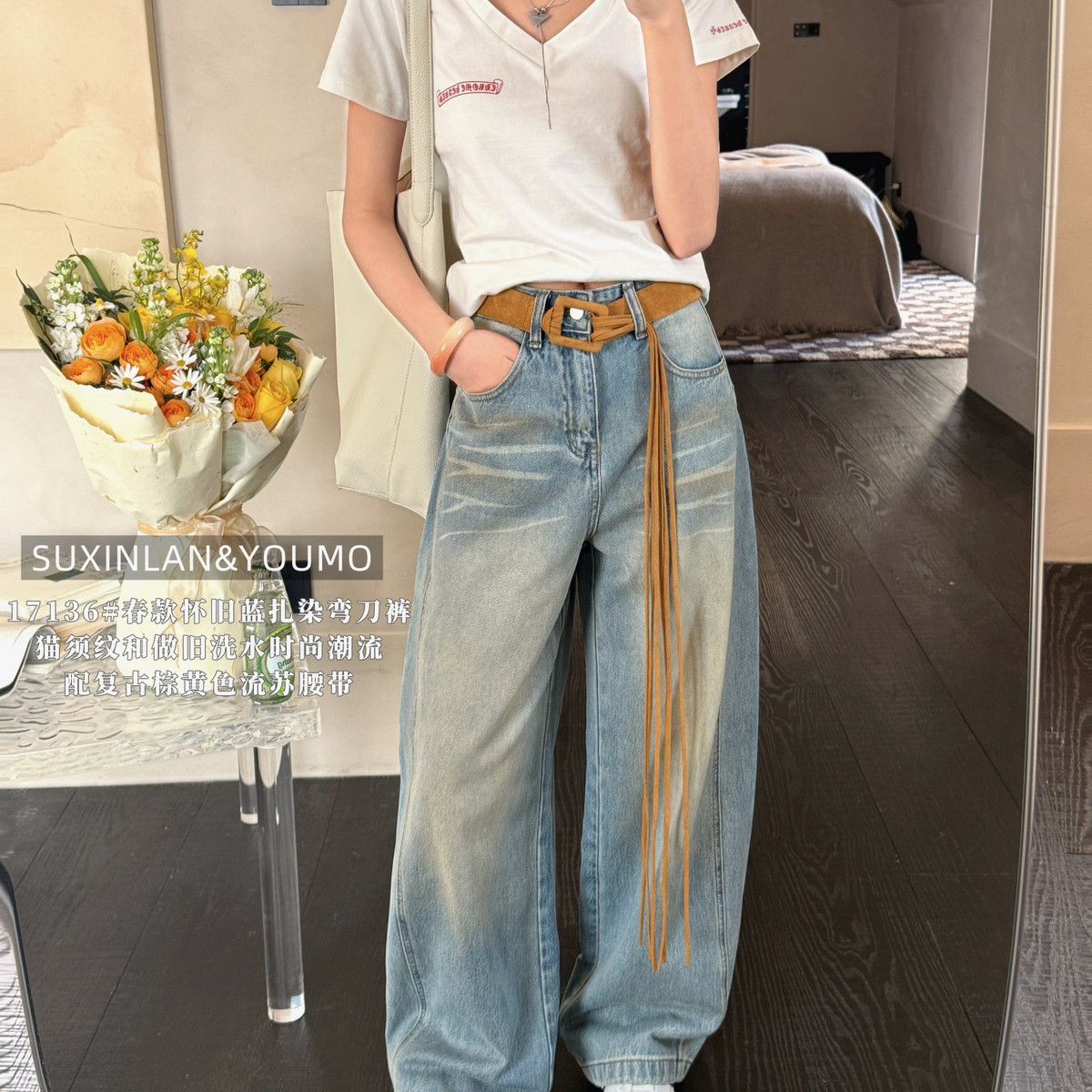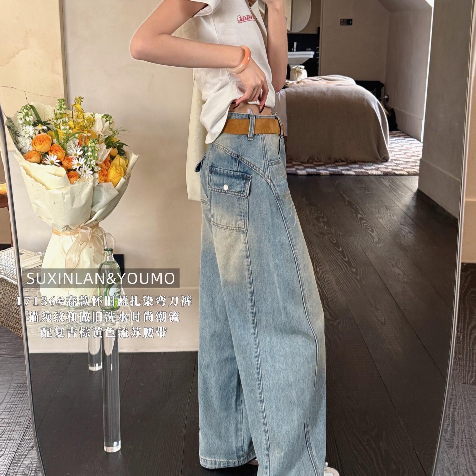 素心兰/YOUMO-弯刀裤后口袋特色拼接设计感阔腿裤牛仔裤(配腰带)