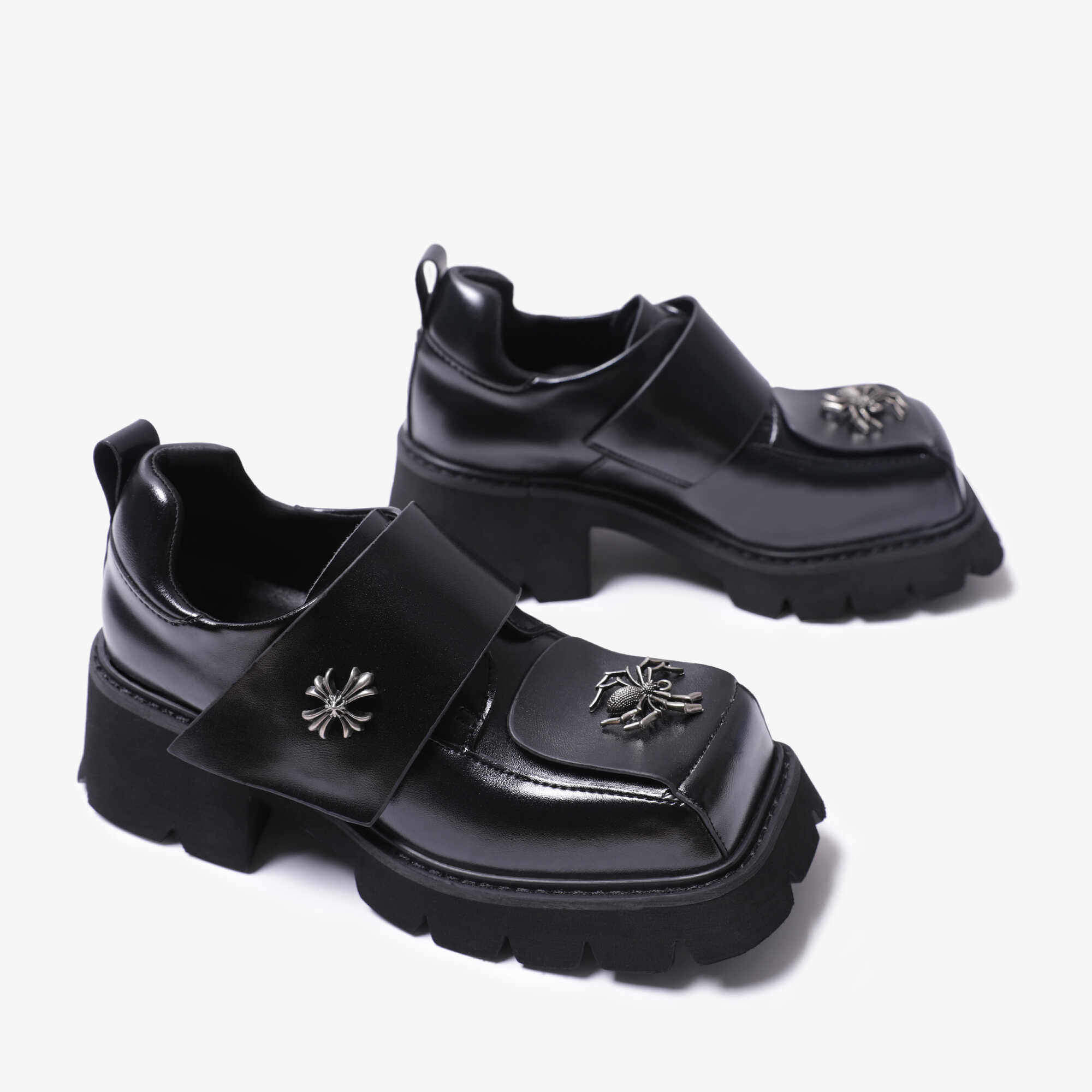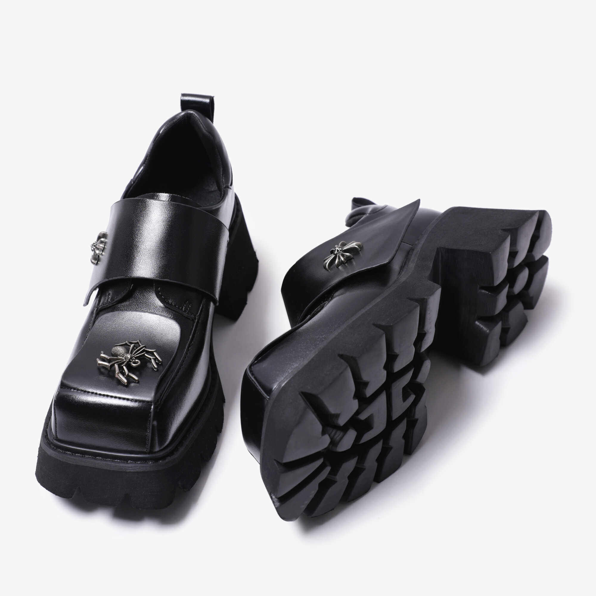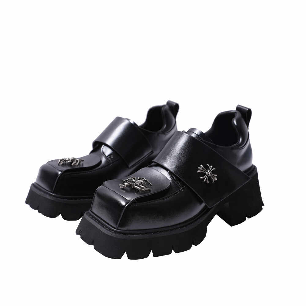pinjiahui 厚底粗跟金属方头小皮鞋女英伦风百搭黑色搭扣真皮单鞋