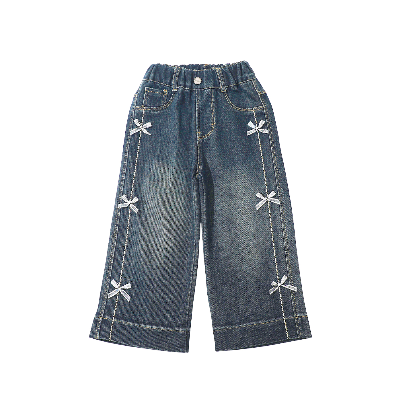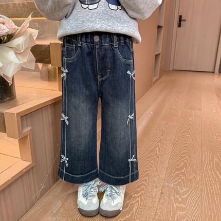 女童牛仔阔腿裤春秋装2025新款儿童洋气裤子宝宝蝴蝶结直筒长裤潮