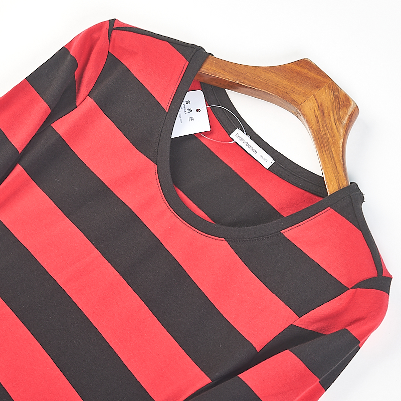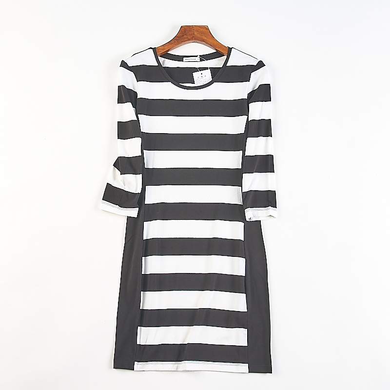 韩版纯棉圆领条纹七分袖连衣裙83701夏秋休闲宽松中长款包臀T恤裙